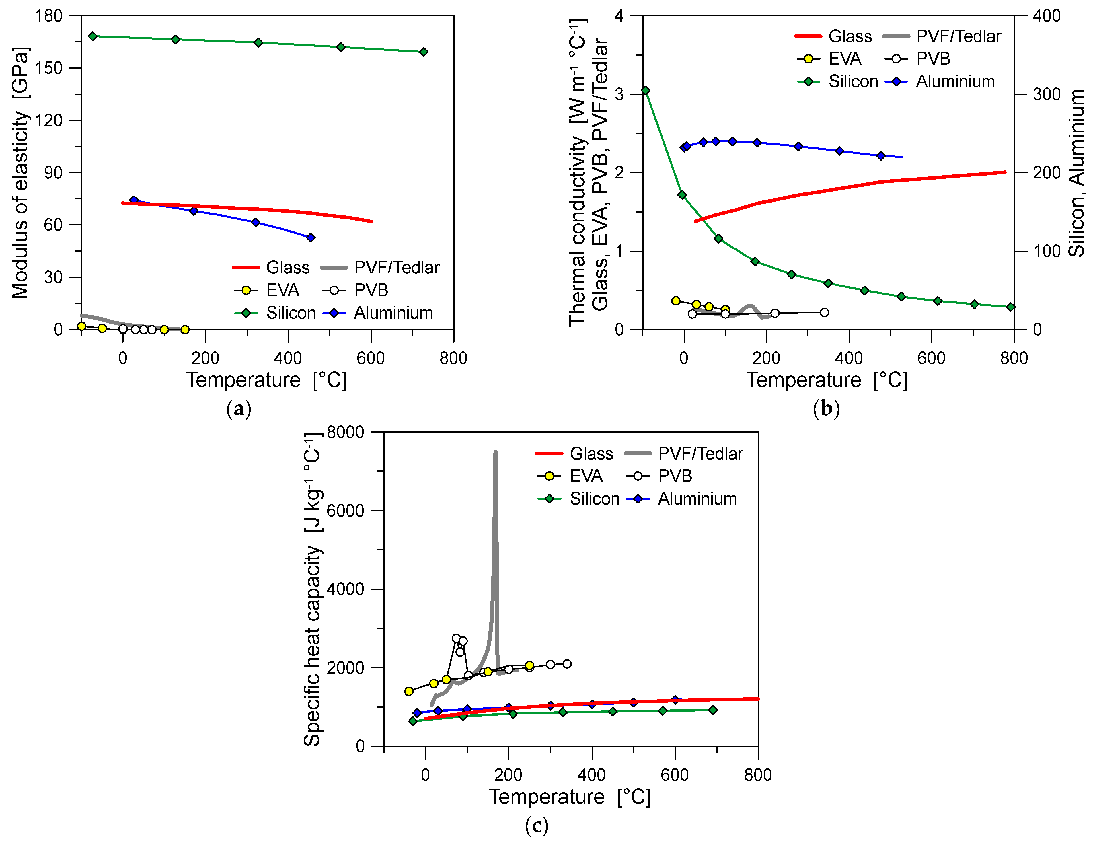 The input properties for all the relevant materials (glass, PVB for the encapsulant, solar cells, and aluminum for metal restraints) were obtained from the literature (Figure 6). A key role in the present simulations was assigned to the temperature-dependency of material properties.