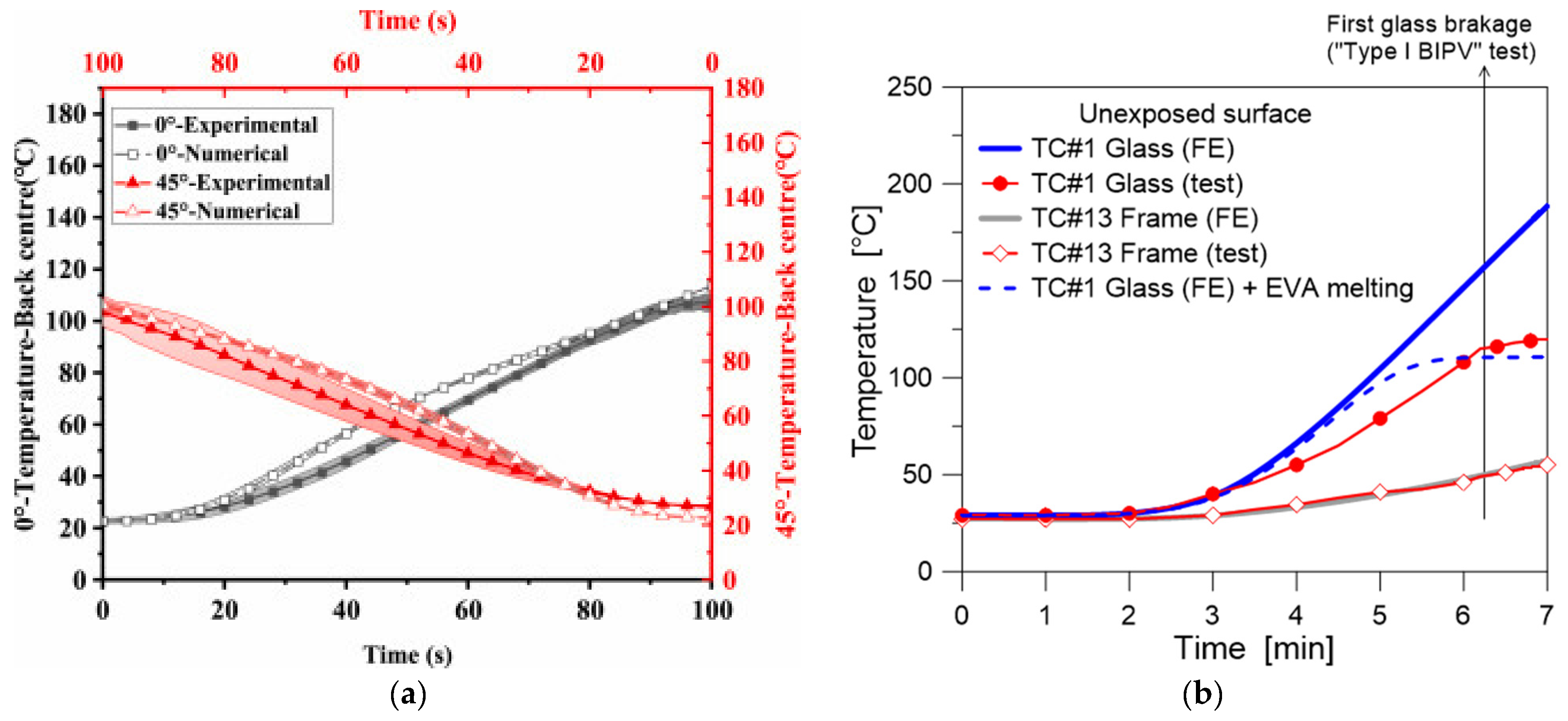 Temperature evolution for BIPV components under elevated temperatures and fire, for modelling validation (ABAQUS): (a) single-glass PV sample (figure reproduced from [] under the terms and conditions of a CC-BY license agreement) and (b) glass–glass BIPV sample in a furnace setup (figure reproduced from [] under the terms and conditions of a CC-BY licence agreement).