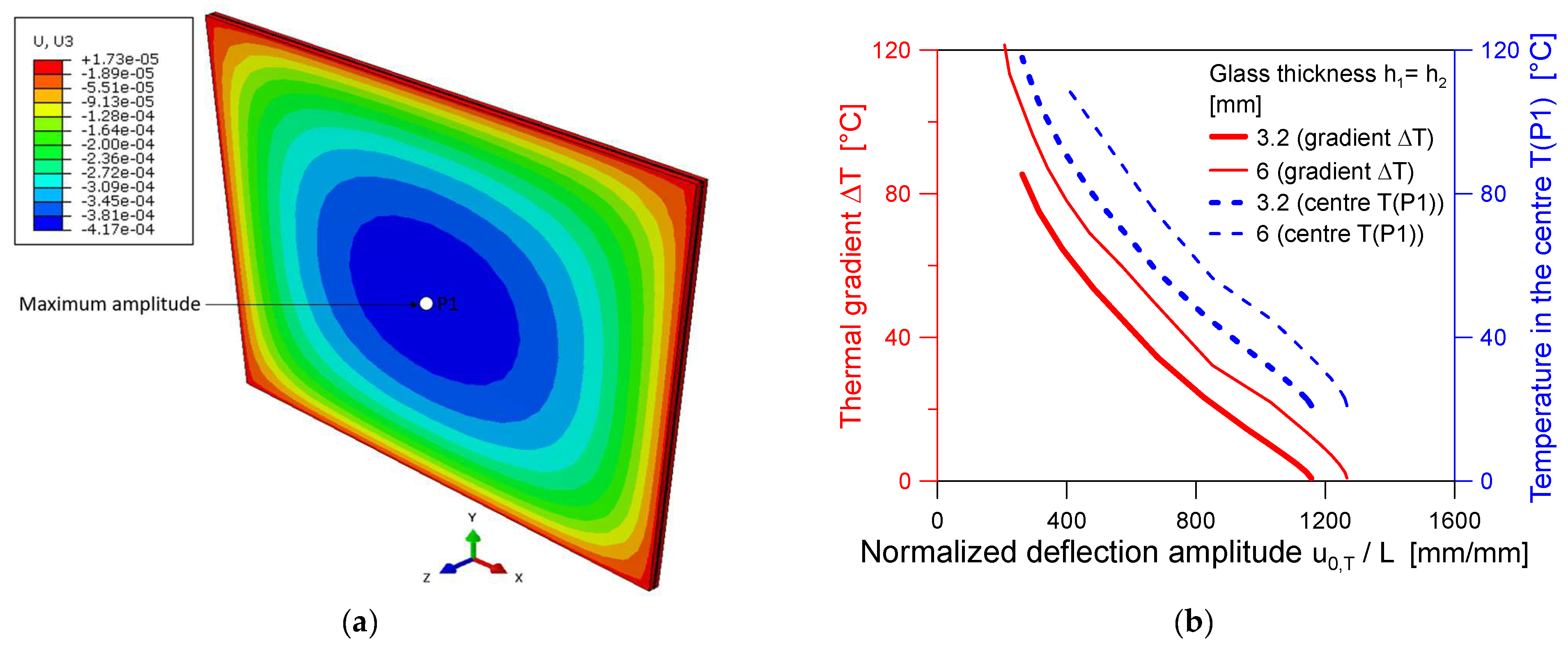 Accordingly, whilst the measured thermal gradients are still not associated with any possible expected thermal shock for the tempered glass layers (i.e., see Figure 11a and Table 2), an important modification to and degradation of the load-bearing capacity for the examined BIPV systems can be observed from the presented results. In this sense, the reported outcomes confirm the possible vulnerability of BIPV systems to elevated temperatures but also show a major sensitivity to many geometrical and mechanical parameters, and thus emphasize the need of a robust multidisciplinary study to assess their safety and optimal use as integrated building components.