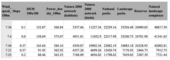 For instance, a wind farm may have been constructed in compliance with existing regulations, but later modifications to the boundaries of protected areas or urban districts by Polish authorities could render the original data obsolete. Consequently, the updated datasets, which incorporate both wind turbine locations and revised maps of protected areas and urban borders, contain zero values for certain parameters.