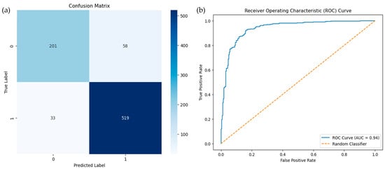 Additional metrics, such as balanced accuracy and Cohen’s Kappa [], provided insights into class imbalance handling. The Receiver Operating Characteristic (ROC) curve and the Area Under the Curve (AUC) metric [] were used to assess the model’s discriminatory power.