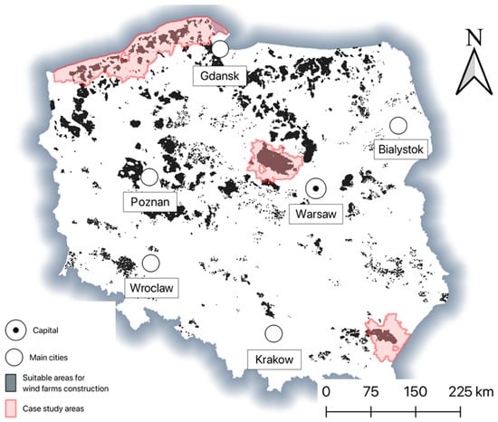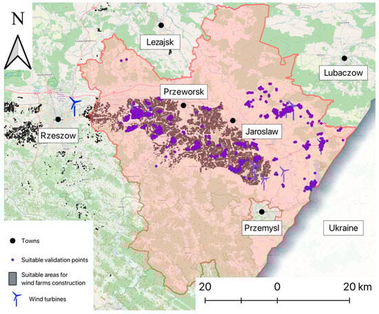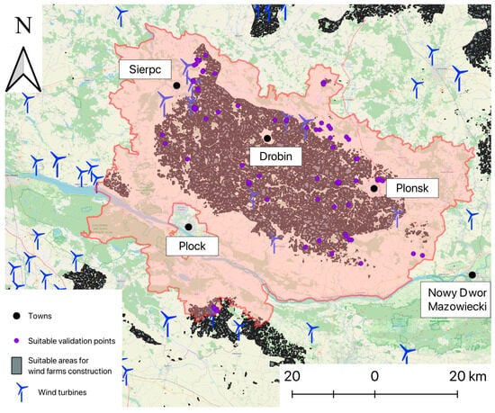 In prior research, a map indicating suitable areas for wind farm construction across Poland was developed using a multi-criteria decision-making (MCDM) approach. Calculations were performed using the no-code environment of the QGIS software (v.3.32 Lima). This suitability map forms a foundational reference for the current study (Figure 3b).