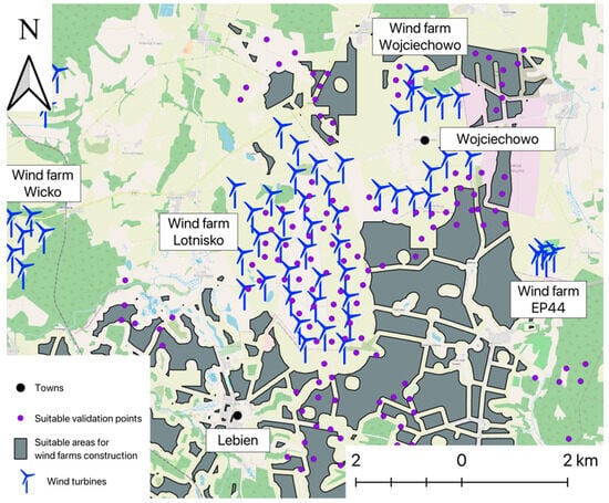 Map of suitable random points for new wind turbine construction (blue color—existing wind turbines, green color—random points suitable for new wind turbine construction, black color—suitable areas). Own elaboration, based on own primary data.