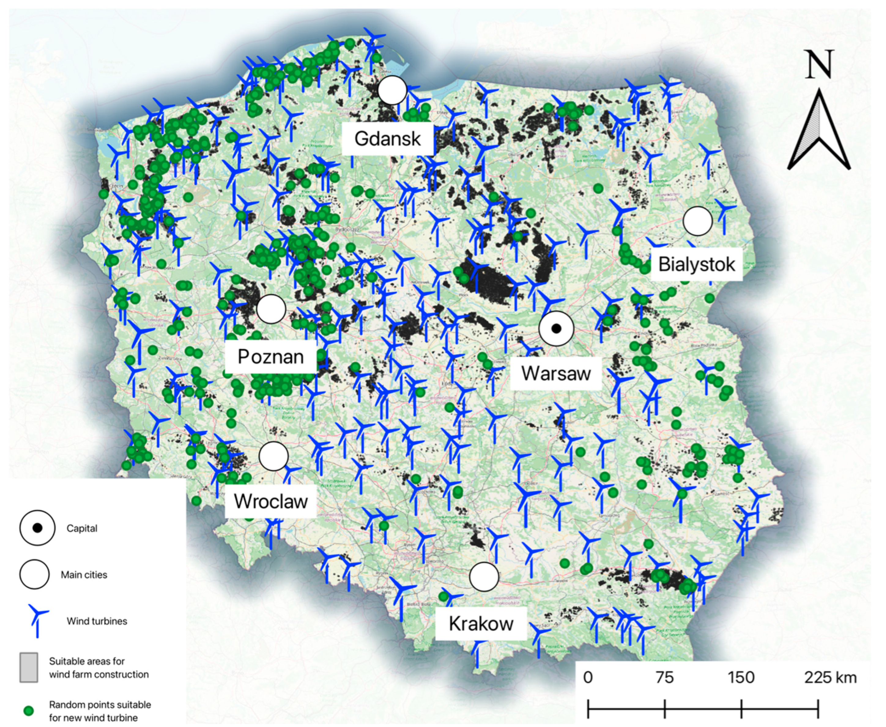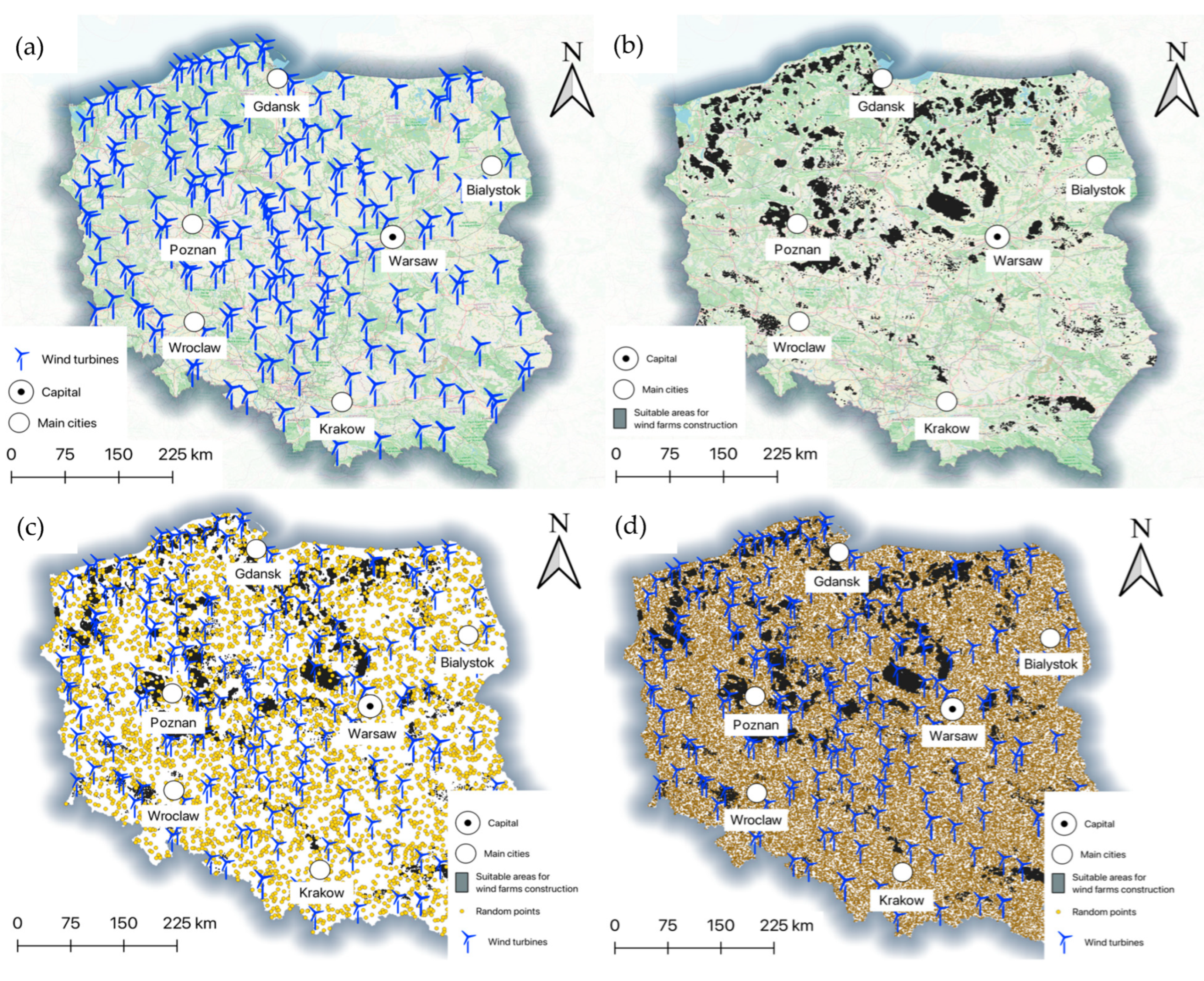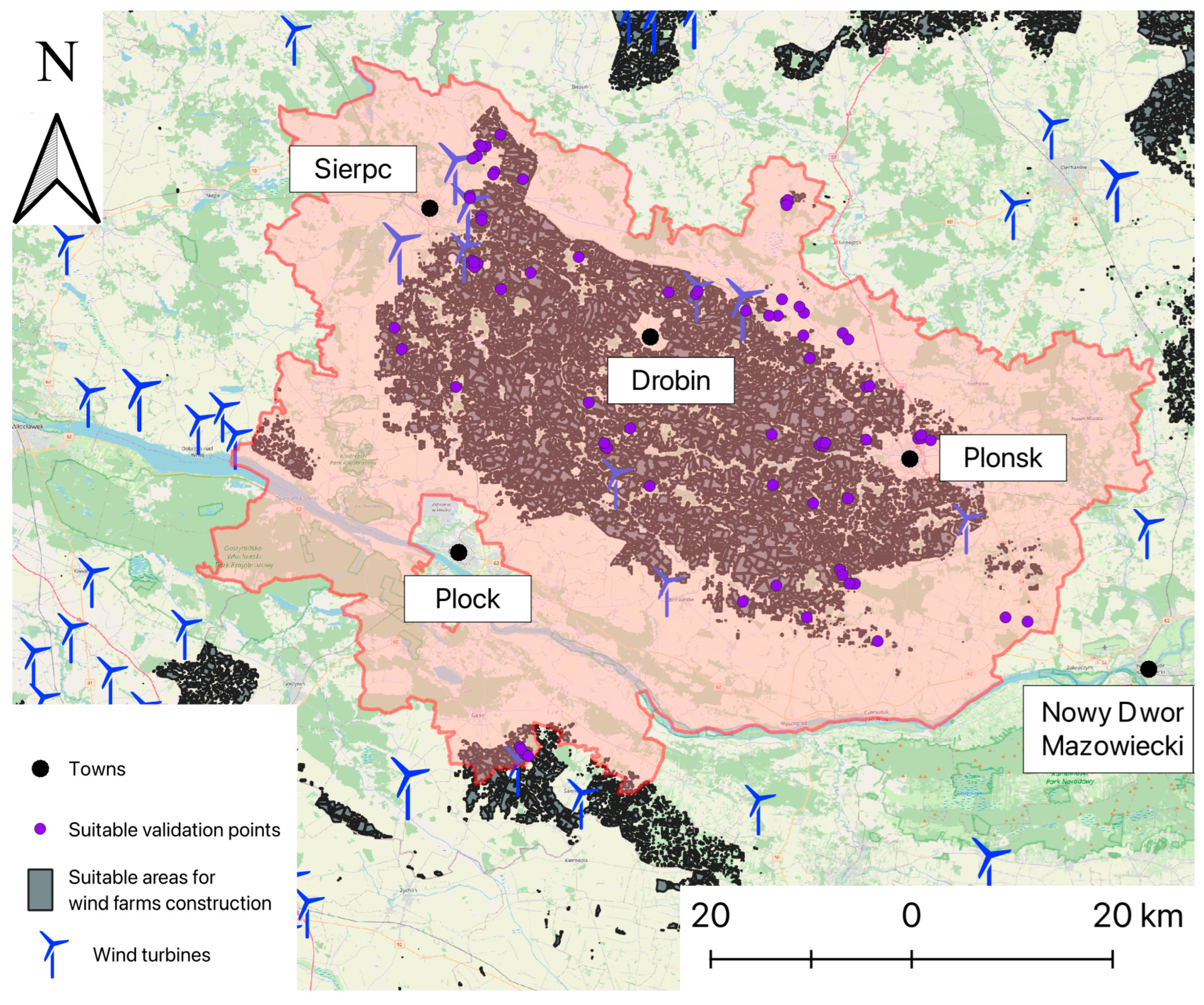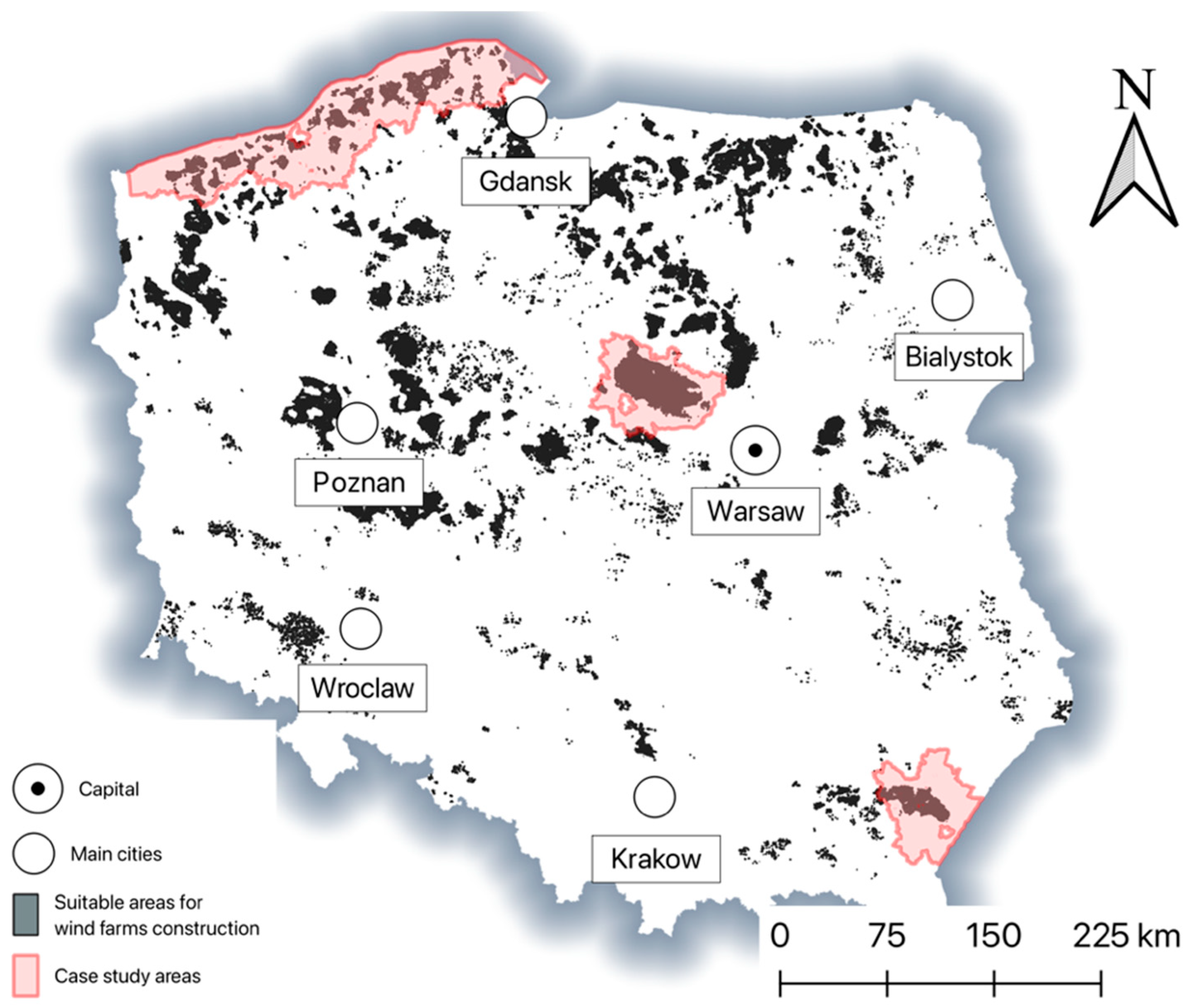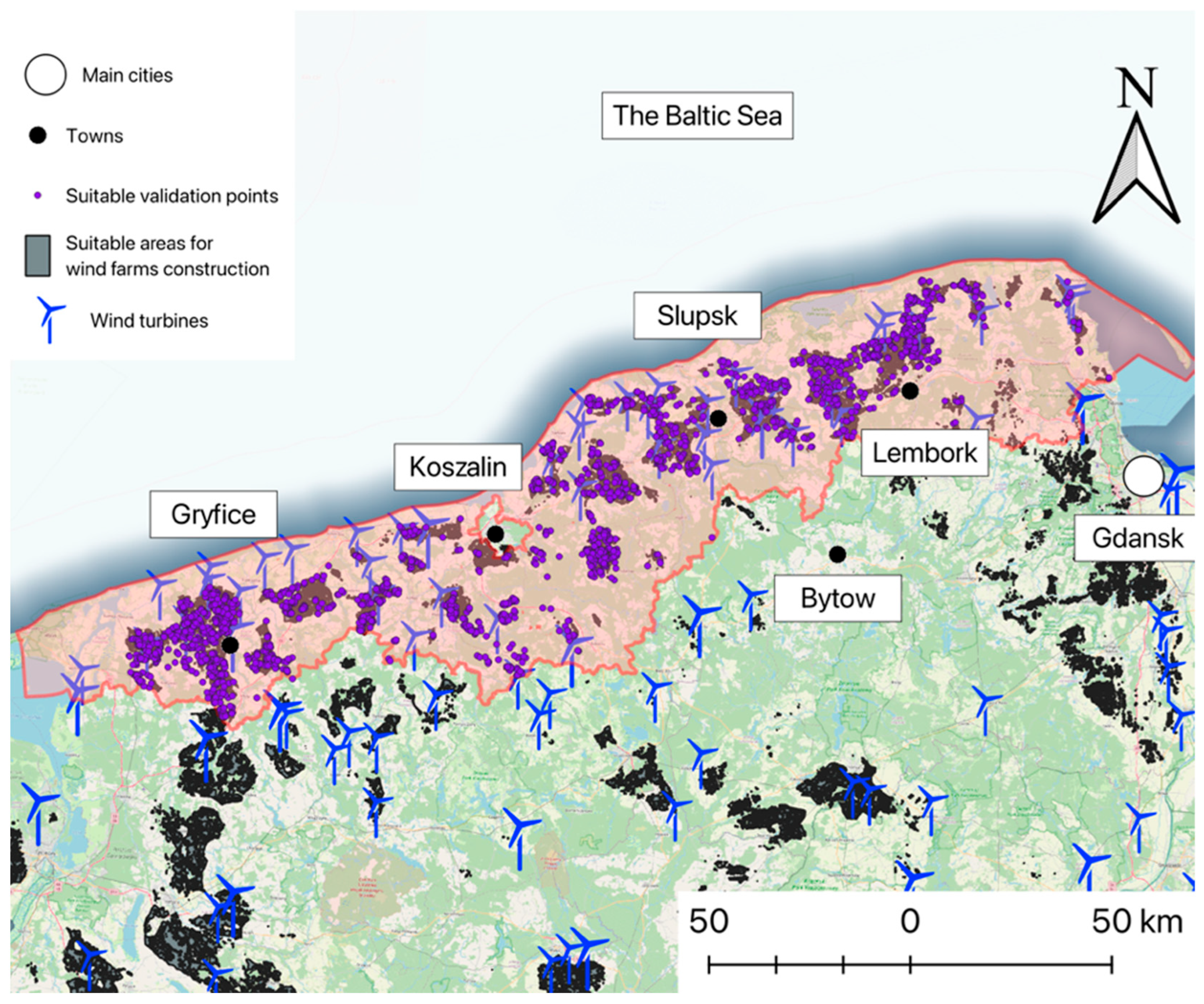 - Amsharuk, A.; Łaska, G. A Review: Existing Methods for Solving Spatial Planning Problems for Wind Turbines in Poland. Energies 2022, 15, 8957. [Google Scholar] [CrossRef]