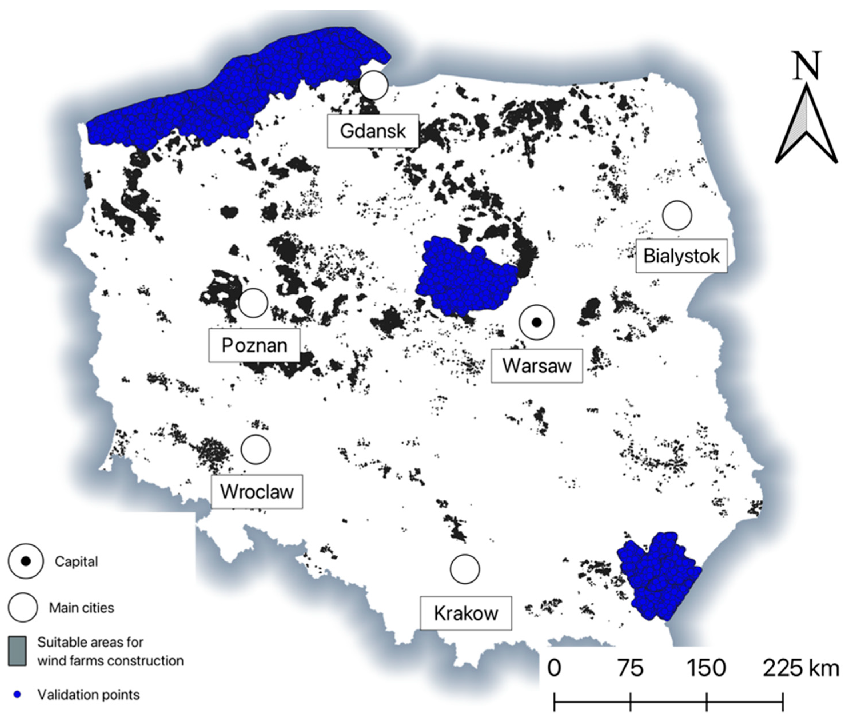 - Amsharuk, A.; Łaska, G. The Approach to Finding Locations for Wind Farms Using GIS and MCDA: Case Study Based on Podlaskie Voivodeship, Poland. Energies 2023, 16, 7107. [Google Scholar] [CrossRef]