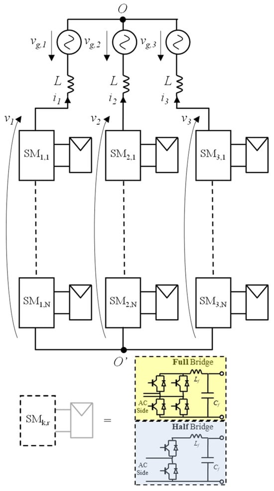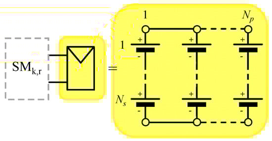 The system under consideration is represented in Figure 1, which shows a three-phase grid-connected single-star Modular Multilevel Converter (MMC) built upon N cascaded modules per phase. Each MMC module (which can have either a Full-Bridge or a Half-Bridge configuration) is connected to a PV array. Figure 2 shows the r-th MMC module of the k-th phase and expands the PV array, which is built upon the parallel connection of Np PV strings, with each string resulting from the series connection of Ns PV modules.