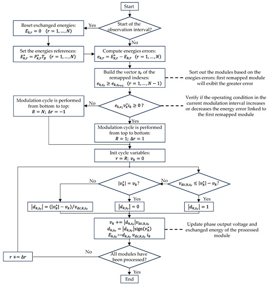 Conversely, when the system current is asymmetrical, i.e., when an unbalanced set of phase power references is considered, the synchronization of the start instant of the modulation blocks with the current zero crossing instants would require to update continuously updating the time delays based on the operation mode and would therefore significantly complicate the whole algorithm. For this reason, the time delays are always kept at . The flowchart of the overall procedure is reported in Figure 4.