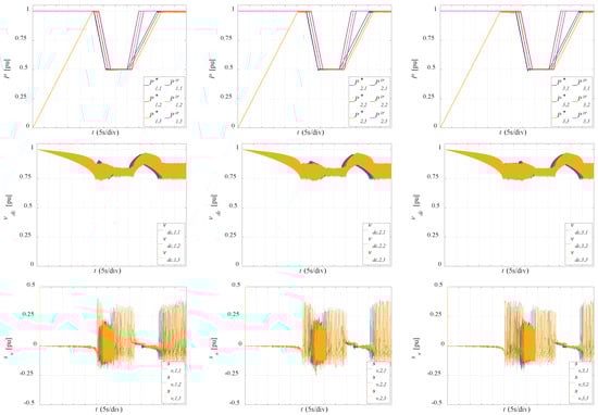 Figure 5 shows across three columns the time behavior of the first, second, and third phase considered quantities. The top row plots depict the time behavior of the power references and of the irradiance powers, the middle and the bottom row plots show respectively the time behavior of the modules’ DC-Link voltages and of the corresponding average slopes. All the reported quantities have been normalized with respect to either their rated value or to an equivalent rated value.