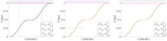 The exchanged energies will then be updated only for the activated modules. The variation of the exchanged energy can be approximated with for the modules driven with a unitary duty cycle, with for the module driven with a fractional duty cycle. While for the generic module, the error amplitude will either increase or decrease based on the sign of the product , the application of (3) ensures that the higher convergence priority is always granted to the module characterized by the maximum error. Since the driving stage ensures that the total energy exchanged by the k-th phase will be set by the end of the observation interval, to , the energies exchanged by the modules will also be constrained to converge to the corresponding references.