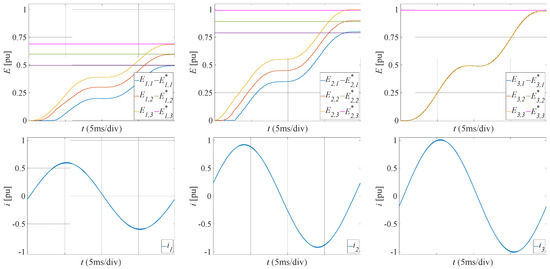 To highlight the operation of the proposed modulation, the time behavior of the modules’ extracted energies and of the grid currents in an observation time interval has also been reported. Figure 6 shows the result at around 25 s (the power references of all modules are kept close to their rated value), while Figure 7 shows the result at around 31 s (power references of the first and second phase modules are strongly unbalanced, while power references of the third phase module are kept close to their rated value). Again, the time behavior of the first, second, and third phase quantities is spanned across three columns. Top plots depict the time behavior of the modules’ extracted energies and corresponding energy references. Bottom plots show the grid currents’ time behavior. It should be noted that, as stated in Section 4, the observation time interval of each phase starts at the corresponding grid voltage zero crossing, i.e., the time origin in the second and third columns is delayed by and with respect to the first column, the time origin.