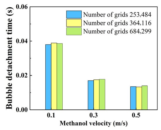 Figure 4 demonstrates the mesh independence verification of the three-dimensional model. The interface thickness control parameter in the phase field is half of the maximum cell size, which changes with the degree of grid refinement. By refining the mesh count from 253,484 to 364,116 and 684,299, the variation in bubble separation time across different mesh resolutions was compared to validate mesh independence. With an inlet velocity of 0.1 m/s, the bubble separation time was compared at different methanol inlet velocities. Under identical operating conditions, the variation in bubble separation time across different mesh sizes was negligible. This indicates that at 253,484 cells, the computational results are independent of mesh size, satisfying the principle of mesh independence. To reduce computation time while maintaining accuracy, this study employs a mesh size of 253,484 for computations.