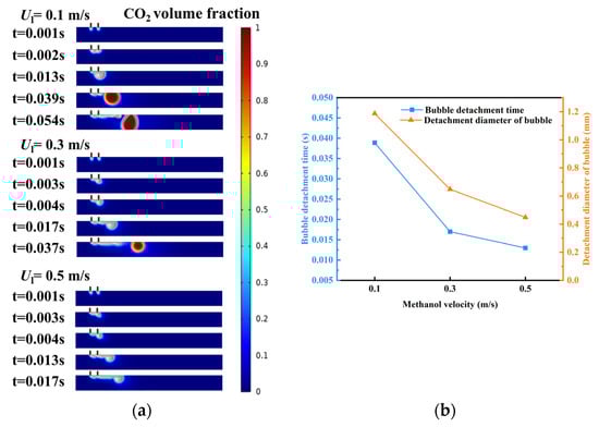 Figure 6a shows the distribution of bubble volume fraction, and Figure 6b illustrates the variation in bubble detachment diameter and detachment time at methanol flow rates of 0.1 m/s, 0.3 m/s, and 0.5 m/s.