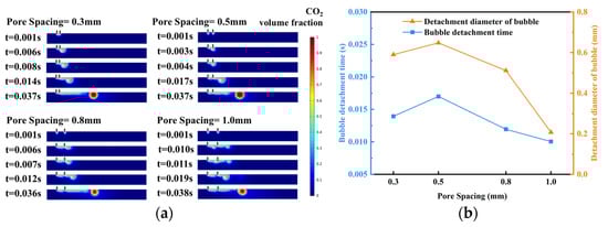 (a) Volume fraction distribution of bubbles and (b) curves of bubble detachment time and detachment diameter under different pore spacing.