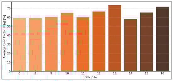 The present study does not directly apply evolutionary optimization algorithms, but a functionally equivalent mechanism is implemented by constructing and visualizing Pareto fronts based on empirically calculated values for efficiency () and load factor (). Thus, it plays the role of a “decoder” of the multi-criteria trade-off in the context of operational planning and allows decision-making that balances between capacity loading and station utilization without going through a full optimization procedure.