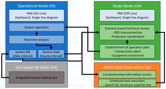 The power grid, one of the nation’s core infrastructures, is segmented for security purposes. KEPCO maintains two separate networks: the FA network, which directly controls power facilities, and the OA network, which supports administrative operations. Figure 5 shows the information flow of ADMS. When transitioning from DAS to ADMS, the DAS database is migrated, and the DER-related data is added to build the ADMS database. After the ADMS database is constructed, application software performs calculations using real-time values measured from terminal devices. The ADMS, installed on the FA network, operates 24 h a day in the operation center. Application software runs according to a schedule. Therefore, key applications such as power flow calculation, load estimation are run on a scheduled basis, thereby enhancing distribution system visibility. The distribution system database, section load data, and operating history produced in the FA network are imported into the OA network for use in study mode. In this mode, operation plans are developed by simulating the system by deriving the setting values of protection devices and voltage control equipment and analyzing the voltage and fault current of the simulated system. The DERs interconnection technical review, which is the focus of this paper, is conducted within this study mode.