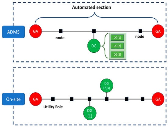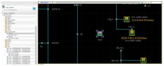 Distribution lines in South Korea are typically operated at 22.9 kV and follow a radial configuration consisting of components such as circuit breakers and protection devices. The ADMS manages the 22.9 kV distribution system and analyzes the higher-level transmission system using equivalent impedance models or SCADA data. The secondary side of the distribution transformer (22.9 kV/380, 230 V) is monitored using Advanced Metering Infrastructure (AMI), which enables real-time measurement and status assessment of the low-voltage network. Figure 6 demonstrates the concept of modeling an actual distribution system within the ADMS environment, representing its structural configuration and relevant components. Due to the complexity of the distribution system, it is represented in a simplified format using a single-line diagram, which highlights the essential components and their interconnections without depicting the full physical layout. Representative equipment in the distribution network includes circuit breakers, switches, conductors, high-voltage customers, and DER, each playing a critical role in maintaining system stability and operational reliability. Many poles, particularly those with distribution transformers, are abstracted and modeled as nodes representing system connection points. The large-capacity DERs (500 kW or more) are directly connected to the 22.9 kV distribution network, with DERs operators installing dedicated interconnection transformers. In contrast, the small-capacity DERs are integrated through distribution transformers installed and managed by KEPCO to ensure safe and consistent operation. DERs models are managed by grouping them into distribution transformer units, allowing for efficient tracking and modeling. Each DERs customer is identified by a unique contract number. For instance, as shown in Figure 6, even when multiple DERs are connected to a single transformer, they are modeled as multiple customers under a single generator. The characteristics of the interconnection transformer are managed in the database, while the individual DERs attributes are stored for customers.