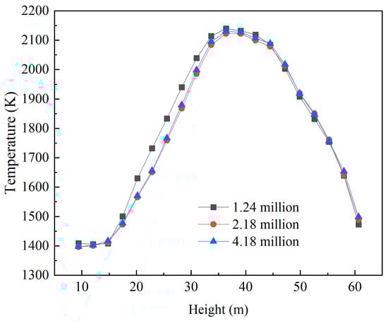 Distribution of flue gas temperature along the height direction of the furnace centerline under three different grid numbers.