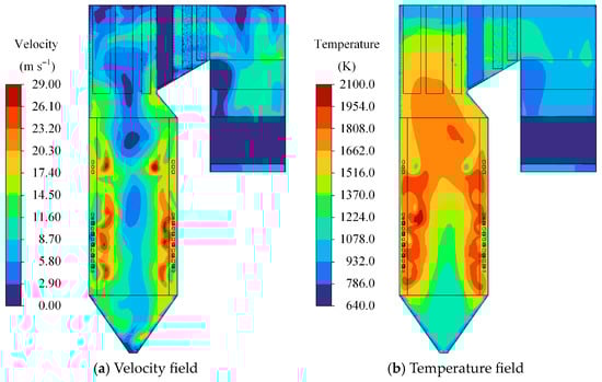 The contours of the velocity field and temperature field under 100% load are shown in Figure 4. The numerical simulation results of flue gas temperature are compared with the boiler design values. Under 100% load, the numerical results of the flue gas temperature at the bottom of the division platen superheater and the flue gas temperature at the furnace outlet are 1609.0 K and 1216.4 K, respectively, while the design values are 1603.2 K and 1239.15 K, respectively. The differences between the two are only 5.8 K and 22.75 K, respectively, which is sufficient to illustrate the accuracy of this model [].