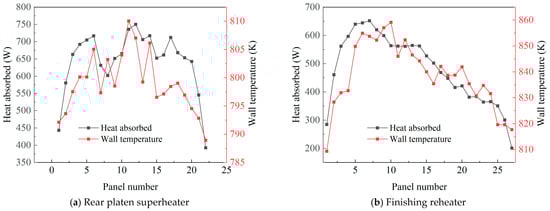 In addition, the calculated heat absorption results of the rear platen superheater and the finishing reheater under operating condition 1 are compared with the measured outlet wall temperature data, as shown in Figure 5. The outlet wall temperature data are obtained by K-type thermocouples arranged at the connection positions between each platen of the rear platen superheater and the finishing reheater and the outlet header. As mentioned before, the boundary conditions of the simulated operating conditions are derived from the historical operating data of the power plant. These wall temperature data are also obtained at the same time and exported from the Safety Instrumented System (SIS). For these superheaters and reheaters, since the inlet working fluid temperature is the same, the wall temperature at the outlet of the platen with higher heat absorption will also be higher. It can be seen that the calculated distribution trend of heat absorption fits well with the measured wall temperature data, which fully indicates the accuracy of the model established in this study.