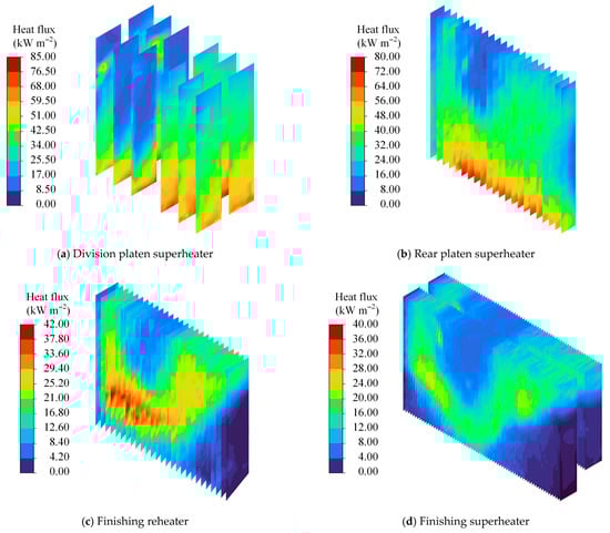Based on the numerical calculation results, the heat absorption of each panel in the high-temperature heating surfaces is calculated. Then, according to Equation (2), the heat absorption deviation of various high-temperature heat-absorbing surfaces in the boiler can be calculated. This study primarily focuses on analyzing the heat absorption deviation of the division panels, rear panels, final reheater, and final superheater. Taking operating condition 1 as an example, the heat absorption of the heating surfaces is shown in Figure 7. Each of these heating surfaces consists of a varying number of panels, and the data obtained correspond to the heat flux on each panel under each operating condition. The heat absorption deviation for each heat-absorbing surface is then calculated based on this heat flux data.