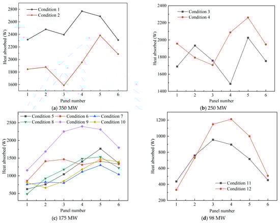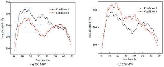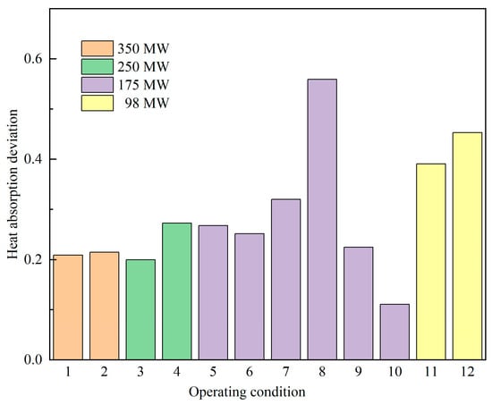 In this boiler, the final superheater consists of 68 heat-absorbing panels. The specific heat absorption distributions under various conditions are shown in Figure 14. The heat absorption deviation for each operating condition is illustrated in Figure 15.