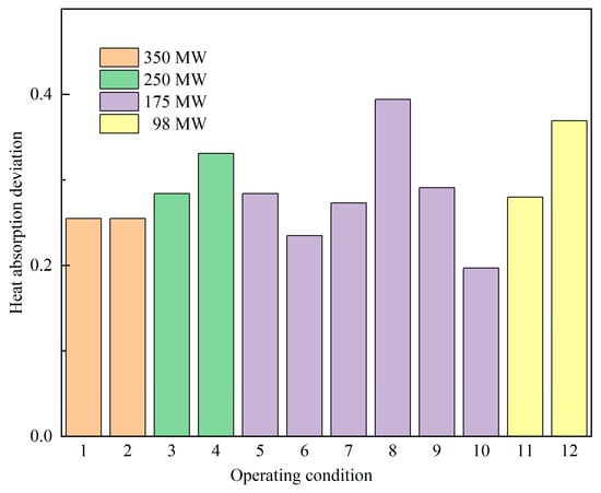 The rear panel in this boiler consists of 22 panels. Calculations of heat absorption are taken for each panel sequentially from the left wall to the right wall, with the heat absorption values under different operating conditions presented in Figure 10. The heat absorption deviation for each operating condition is illustrated in Figure 11.