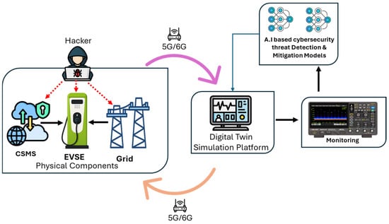 In 5G/6G environments, the inherent risks are intensified by features such as ultra-low latency, high device density, and distributed edge computing. These characteristics necessitate the development and deployment of advanced and adaptive security mechanisms to effectively address the associated challenges []. In the face of these emerging challenges, Digital Twin (DT) technology has emerged as a transformative concept with the potential to redefine cybersecurity approaches within cyber–physical infrastructures such as EVCS. A DT is a high-fidelity, real-time virtual model of a physical system that maintains synchronization with its physical counterpart through continuous data exchange, as illustrated in Figure 1 [].