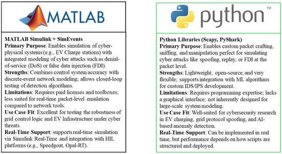 Python is widely used for DTs implementation in EVCS cybersecurity due to its flexibility, extensive libraries, and open-source nature, but it differs from tools like MATLAB/Simulink, Modelica, and Julia in capability and outcome []. Python frameworks such as OpenModelica, SimPy, or custom environments with libraries like NumPy, SciPy, and TensorFlow enable high-fidelity modeling of EVCS components, including power flows, communication protocols, and AI-driven anomaly detection []. Its strength lies in rapid prototyping and machine learning integration for real-time threat analysis, but it requires significant customization to match the precision of domain-specific tools [].