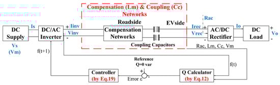 A critical component of any CWPT system is its compensation network, which resonates with the coupling capacitance to enable efficient power transfer. Research has explored various topologies, from simple L-series compensation to complex cascaded networks like LCL and LCLC [,]. While higher-order networks offer benefits like inherent filtering and reduced sensitivity to parameter variations, their complex structure, involving multiple inductors and capacitors, makes them difficult to control dynamically and increases the component count on the EV side [].