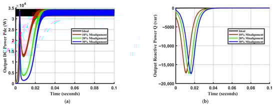 To evaluate the controller’s adaptability, the system was tested under 10%, 20%, and 30% misalignment, corresponding to step changes in coupling capacitance. The RLS observer accurately estimated the new capacitance, allowing the ASMC loop to adjust the inverter frequency accordingly (Figure 9). The results indicate that the settling time of the AC output frequency increases from 25 ms at 10% misalignment to 45 ms at 30% misalignment. The output voltages and currents exhibit consistent transient behavior, as shown in Figure 10. Despite wide variations in the coupling capacitance across different misalignment scenarios, the proposed controller successfully eliminates reactive power transfer from the primary to the EV side, as demonstrated in Figure 11. Furthermore, after the transient period, the transferred active power remains nearly identical across all scenarios. This consistency is achieved because the controller continuously and precisely adjusts the frequency to maintain resonant operation in the LC-type coupler, causing it to behave as an effective short circuit. It is important to note that during the transient period, the reactive power can peak at approximately −17.5 kvar, underscoring the critical importance of rapid frequency adaptation. The extreme misalignment capability of the proposed ASMC–RLS controller is determined by the converter’s maximum switching frequency and the corresponding minimum achievable coupling capacitance. Based on the design parameters (L = 101.32 µH, Cref = 1000 pF, fmax = 1 MHz), the controller can maintain resonance for capacitance values as low as approximately 250 pF—equivalent to a 75% reduction in coupling capacitance. This corresponds to a wide misalignment range well beyond typical EV charging conditions. Therefore, the practical misalignment tolerance of the proposed method is primarily limited by coupler geometry and converter hardware, rather than by the controller itself.