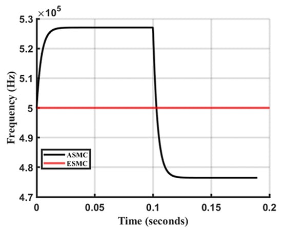 A step change in coupling capacitance from 900 pF to 1100 pF was applied to compare the performance of the proposed ASMC–RLS system with a conventional SMC method, as proposed in []. It should be noted that under a misalignment (e.g., 10% in this test), the ESMC system does not update the coupler capacitance in the control equations. Hence, as shown in Figure 12, this results in a severe reduction in the LC circuit’s output voltage (Vrec) by a factor of 10 compared to the 400 V DC input, despite the reactive power converging to zero. Consequently, the transferred active power is significantly reduced. These results demonstrate that the conventional ESMC requires modification with real-time capacitance estimation to track the exact resonance frequency effectively. In contrast, during step changes in coupling capacitance value from 900 pF to 1100 pF, the proposed ASMC–RLS method accurately tracks the variations and updates the resonance frequency within 25–35 ms, as illustrated in Figure 13, thereby aligning the inverter’s output with the true resonant point.