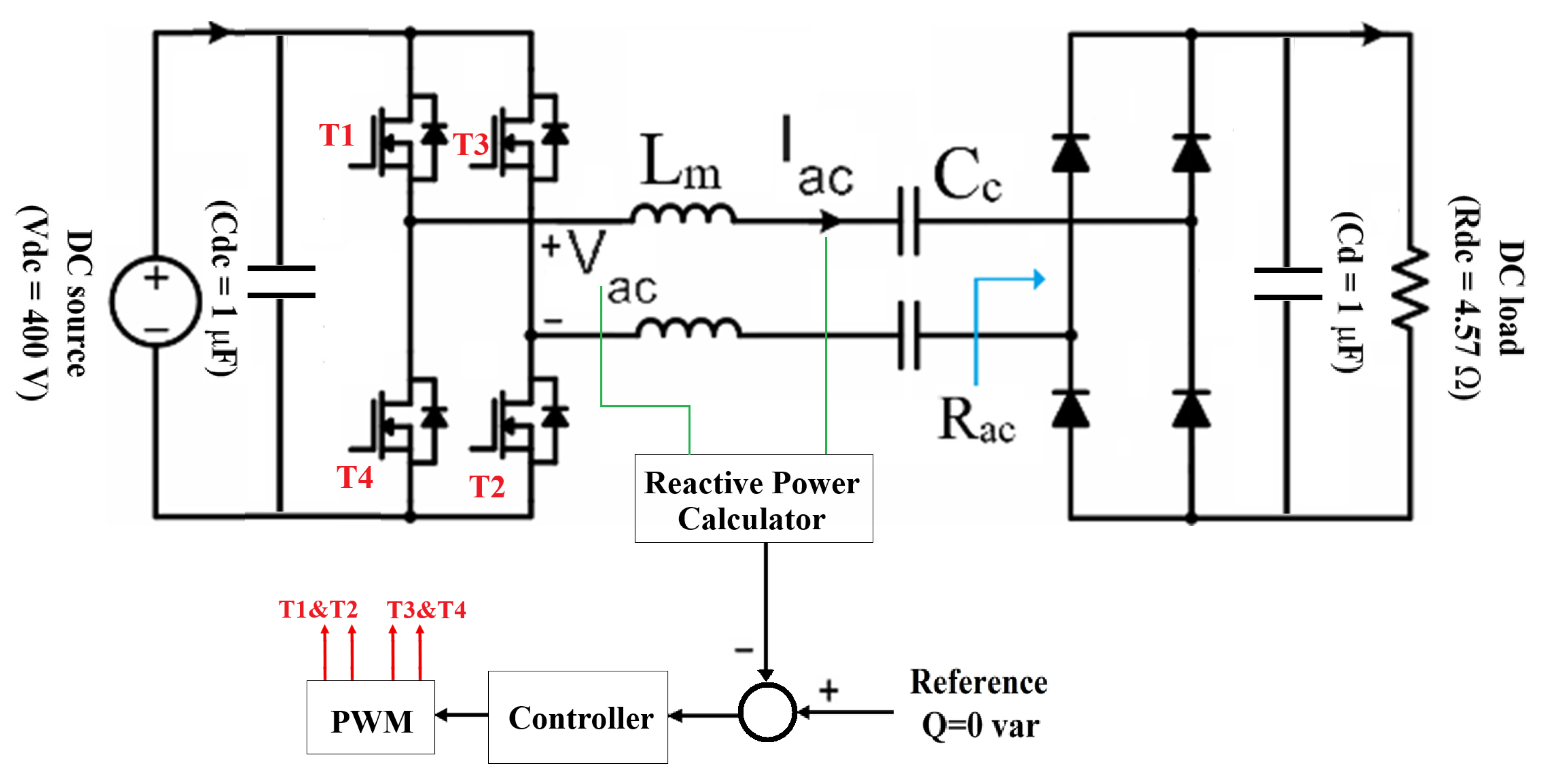 - Equations (5) and (6) show explicitly that forcing is necessary but not sufficient to guarantee full active power transfer unless the controller ensures the zero of the numerator in (6) is the same zero that minimizes the imaginary term in the denominator, i.e., the controller must place at the true resonance . This observation explains the pseudo-resonance problem: a controller that drives the measured to zero using incorrect or stale parameter values can still end up off the true resonance and thus yield severely reduced .