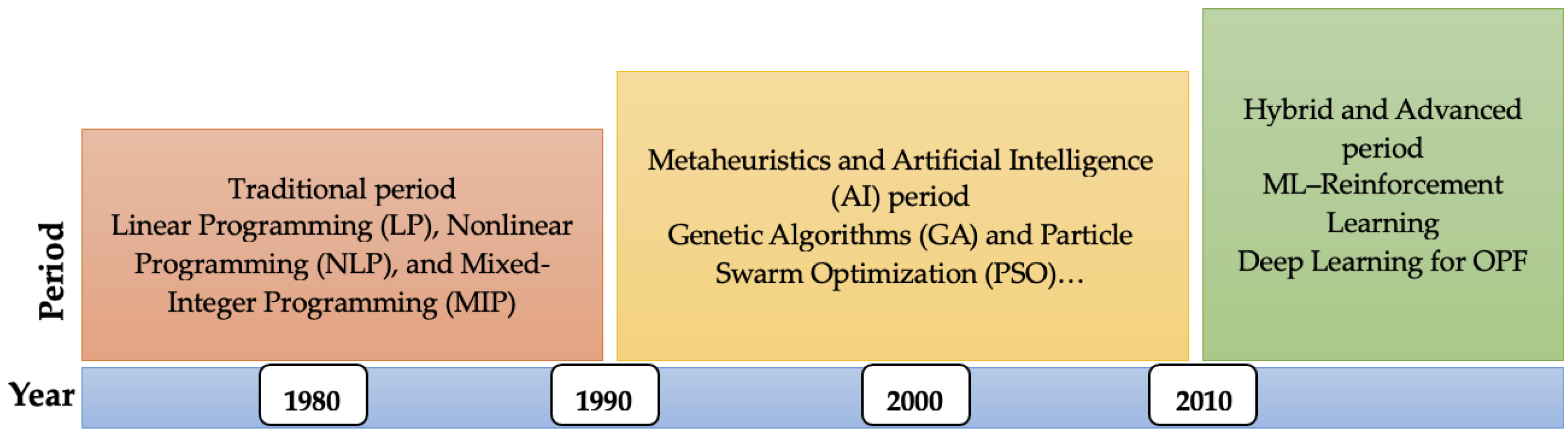 | Year | Electrical Network Reconfiguration | Economic Dispatch/Optimal Power Flow | Power Distribution Planning | Operational Planning with RESs Integration |