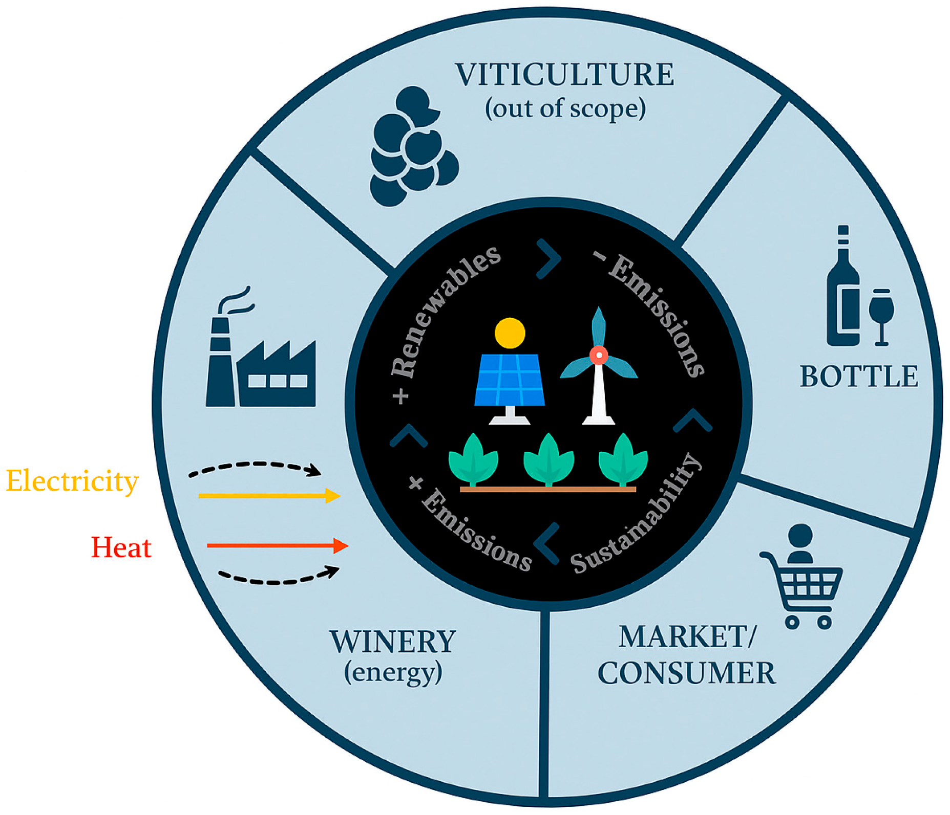 3] quantified the contribution of electricity use and thermal energy in Mediterranean wineries, showing that cellar operations represent a dominant share of total CF. The study in [
