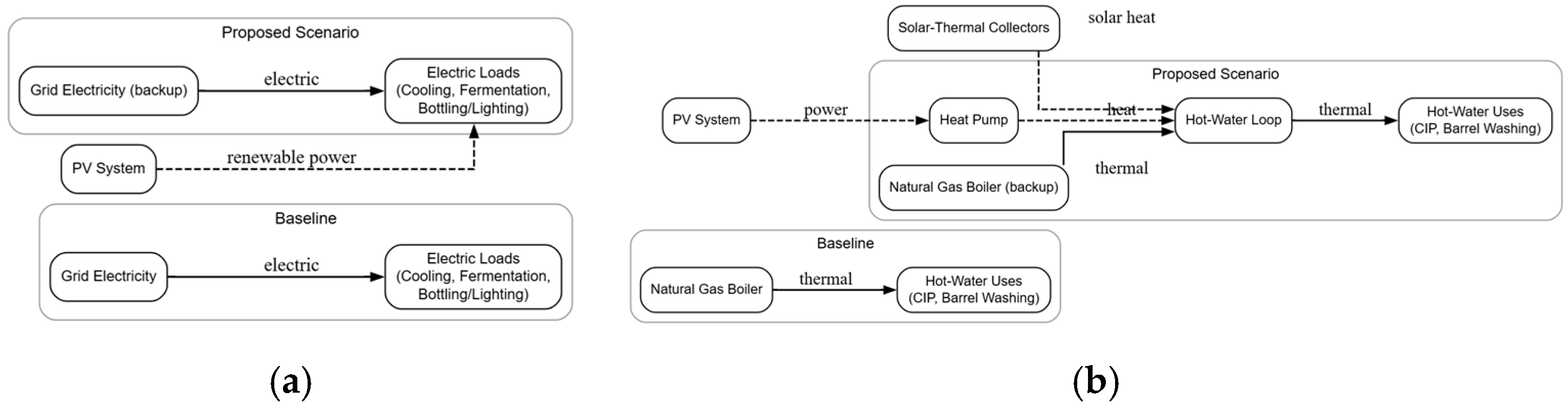 Figure 3a,b presents a functional view of how energy is supplied and used in the two wineries before and after the proposed upgrades. In the baseline configuration, the cellars depend entirely on grid electricity for refrigeration, fermentation control, bottling, and lighting, and on natural gas for hot-water production. The proposed configuration introduces renewable and high-efficiency technologies: photovoltaic panels generate most of the electricity demand on-site, while a heat pump and solar-thermal loop deliver low-carbon heat, while the existing gas boiler is retained as a backup. Together, these schemes illustrate the transition from a fossil-dominated to a renewable-integrated winery energy system and form the basis for the scenario analysis that follows.
