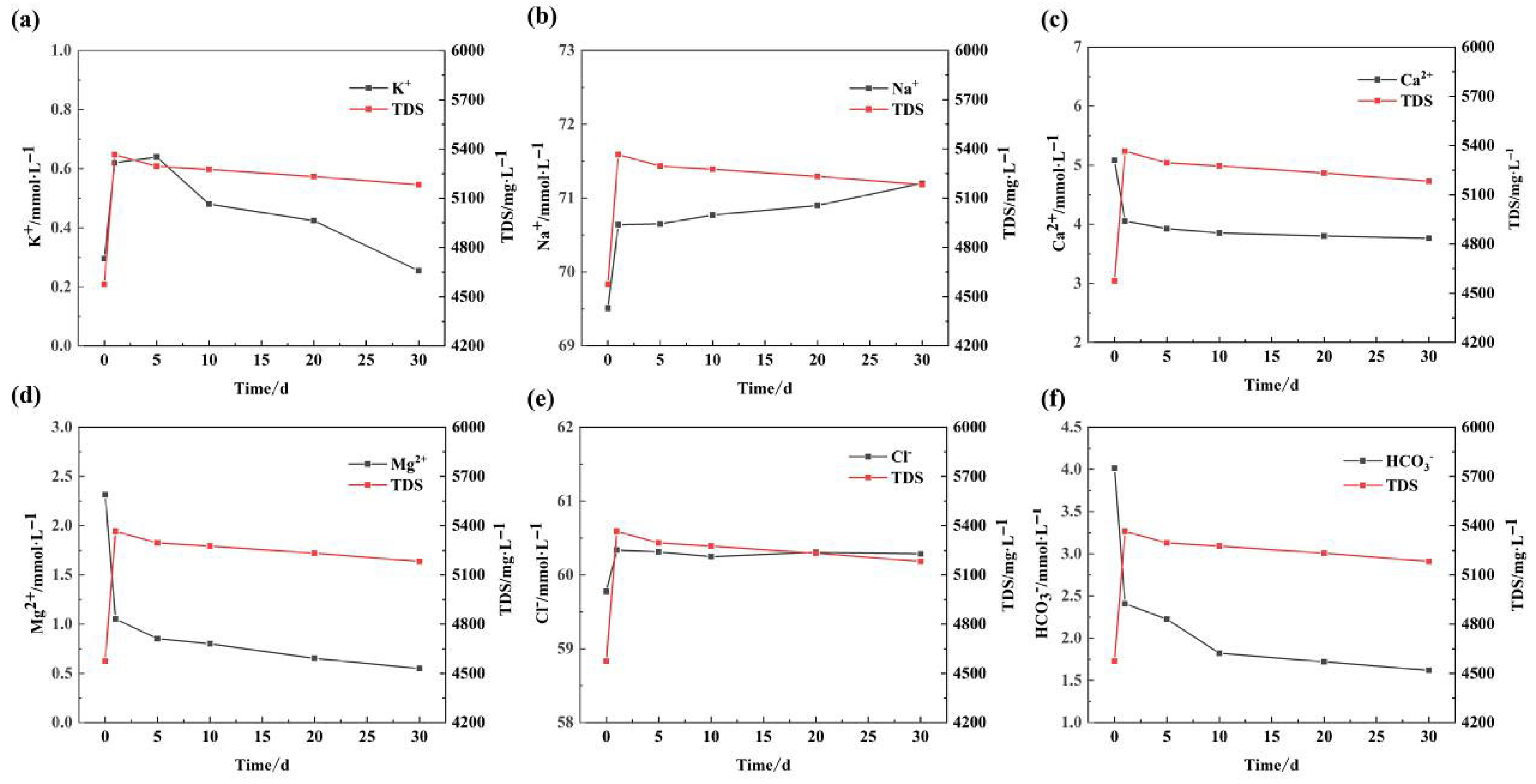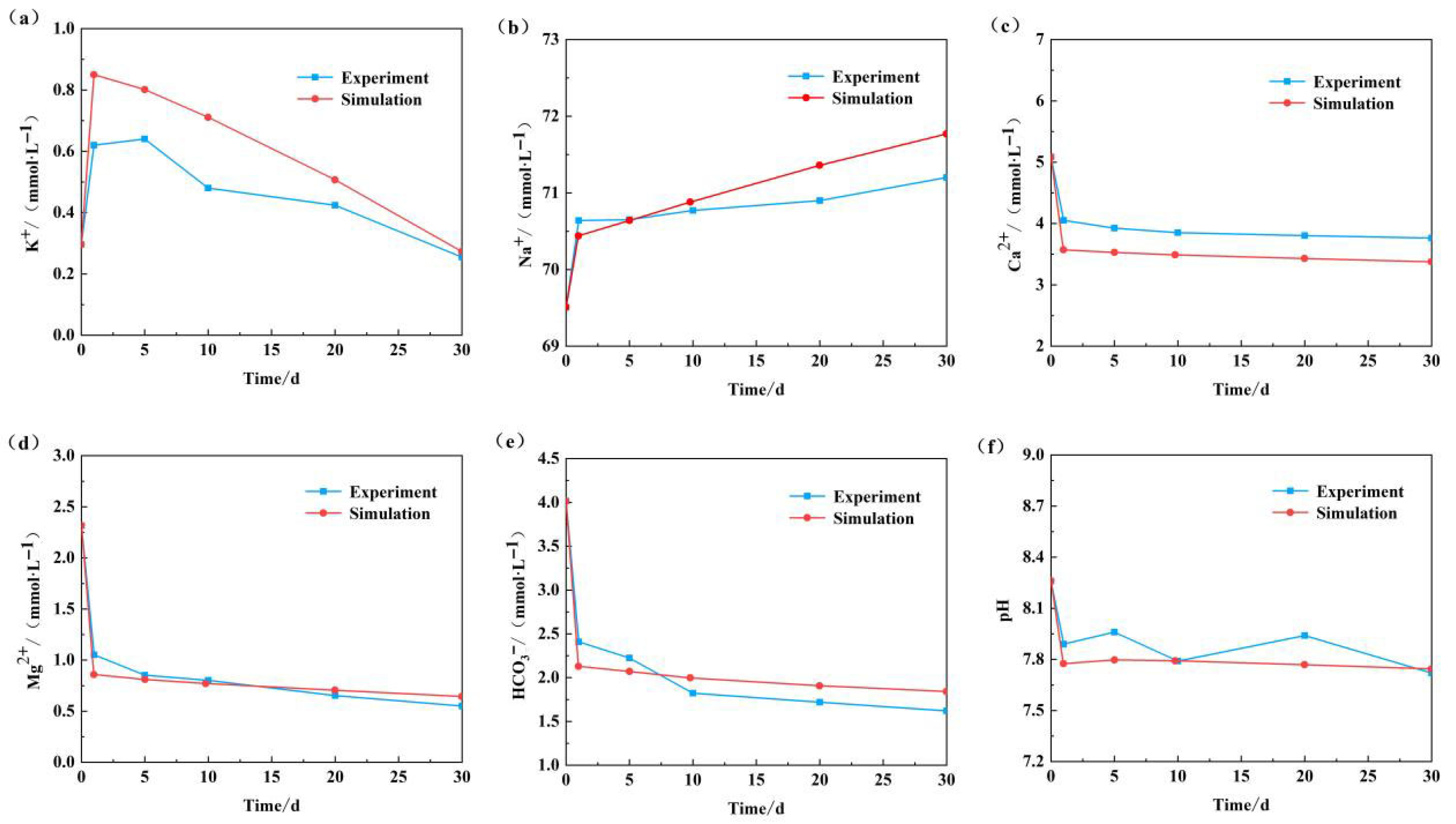 Following a 30-day simulation period, the K+ concentration exhibited a pattern of initial increase, followed by a decline. In contrast, the Na+ concentration continued to rise, with a relatively stable rate of increase. The changes in the concentrations of Ca2+, Mg2+, and HCO3− were characterized by a continuous decrease. The overall change trend is, in general, accordance with the experimental results, which demonstrate that the fitting effect is satisfactory and provide further confirmation of the reliability of the experimental results and simulation parameters.
