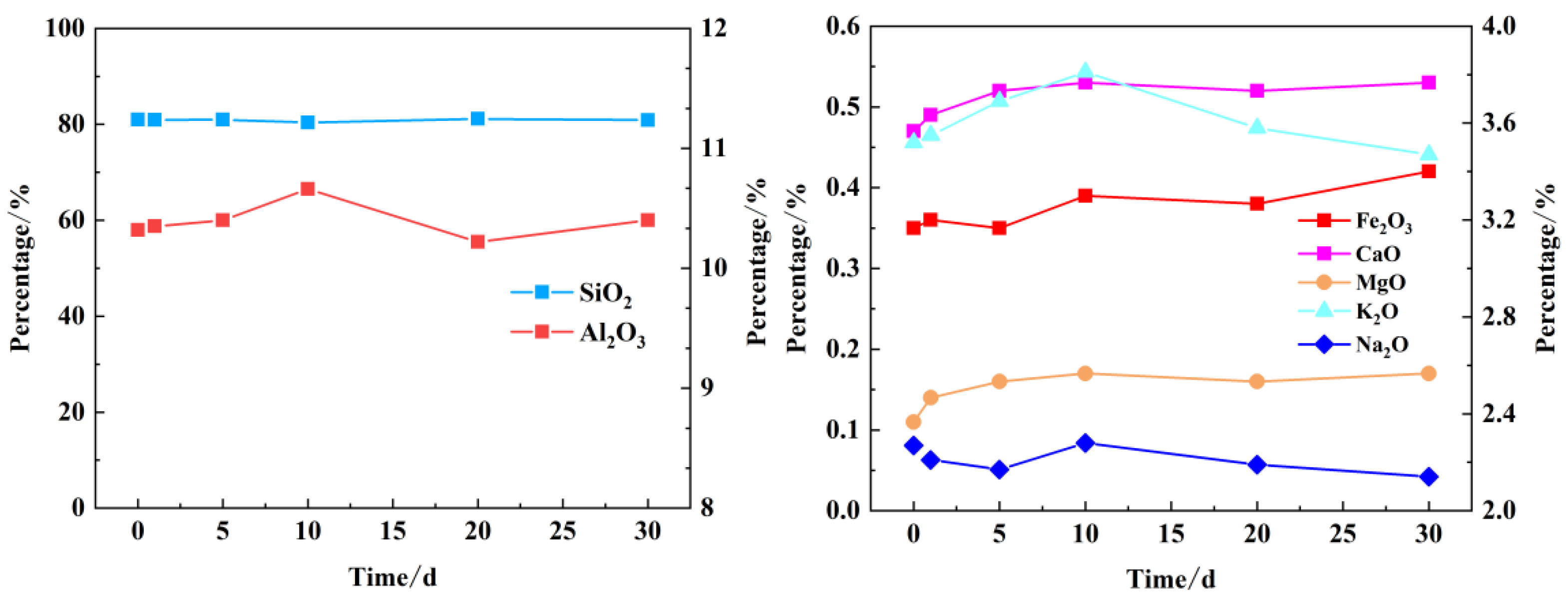 In the early stage of the water–rock reaction, the Cl− content appeared to rise, because Cl− almost does not produce secondary precipitation with other major metal cations, so it can basically be judged that when the water–rock reaction is carried out to 5 d, the soluble component is basically completely dissolved or basically saturated, and the trend of the change in the Cl− content is a rapid rise in the early stage, and then gradually stabilized in the later stage.