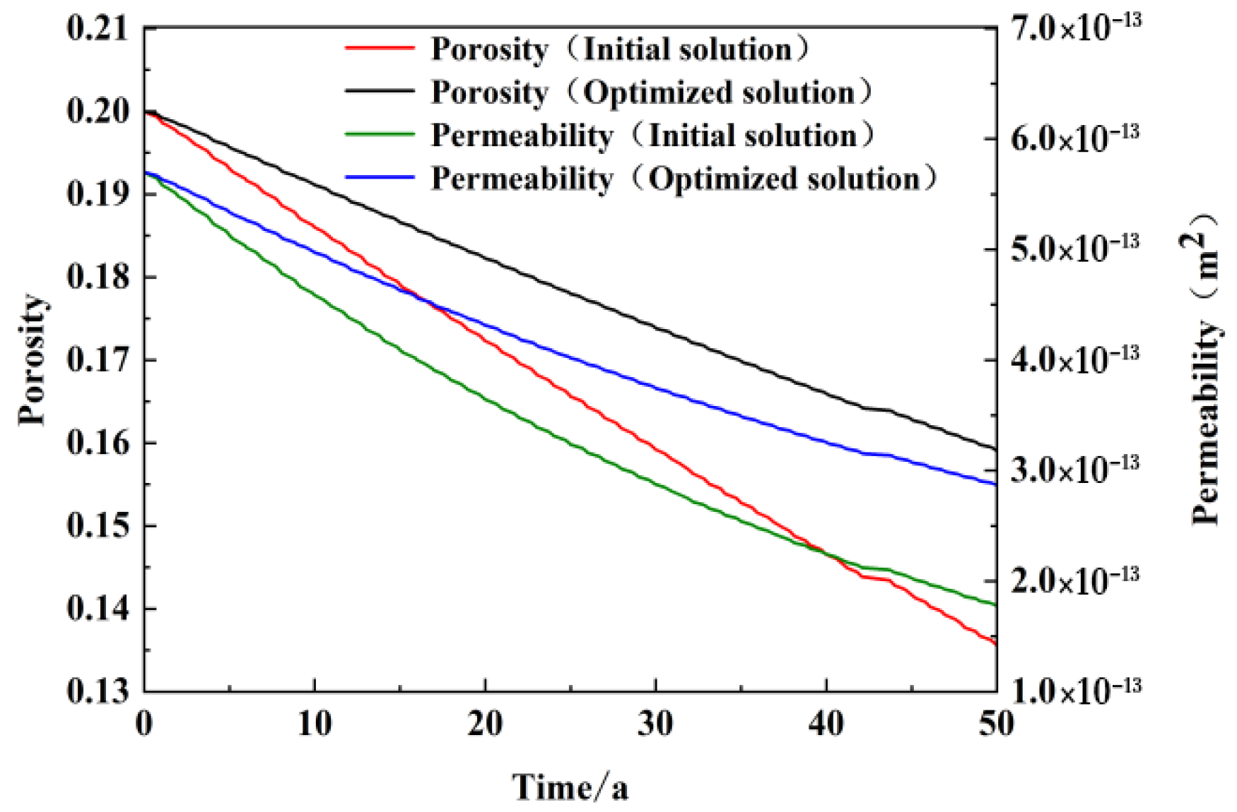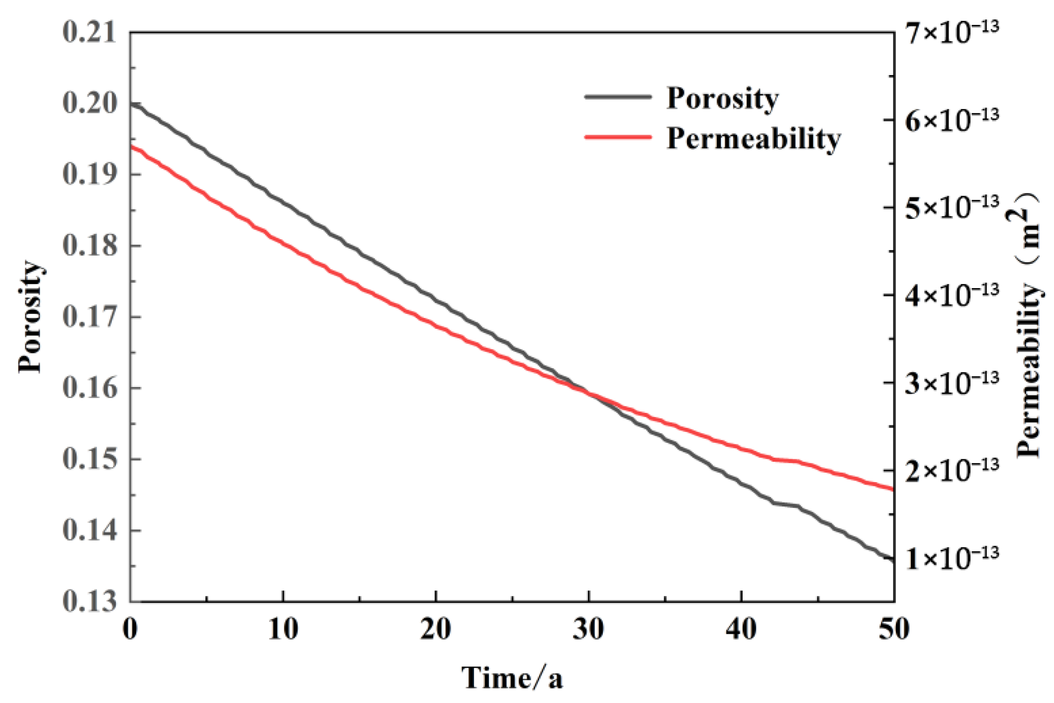 Figure 9 illustrates the pattern of change in pore penetration in the vicinity of the recharge wells following 50 years of intermittent operation of the model. The initial value of sandstone porosity in the vicinity of the recharge wells was 0.2, which subsequently decreased to 0.136 at the conclusion of the 50-year simulation. The overall trend in porosity over time in the vicinity of the recharge wells was a continuous linear decline, with some degree of fluctuation in porosity during periods of cessation of recharge during non-heating periods. However, the trend was less pronounced. The initial permeability of 5.7 × 10
