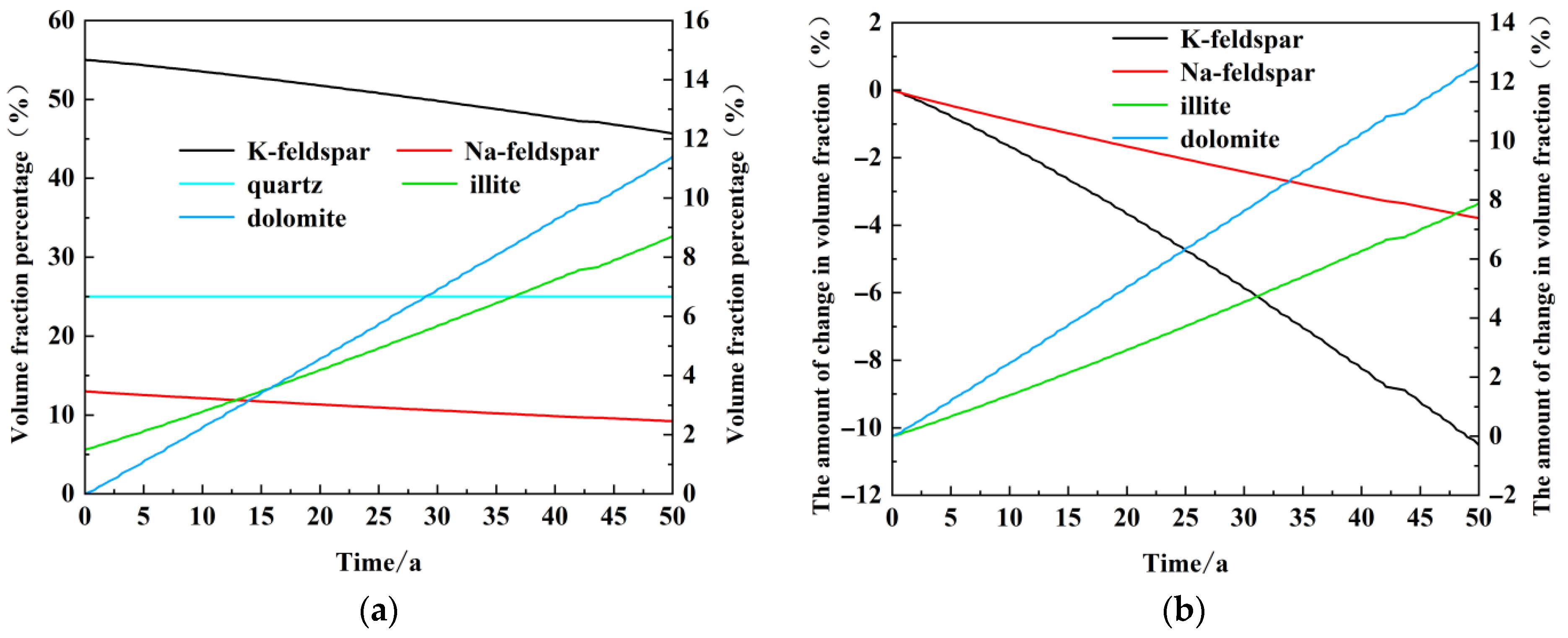 Figure 10b illustrates the extent of the absolute change in the volume fraction of several major dissolved and precipitated minerals over the course of the model run. As illustrated in