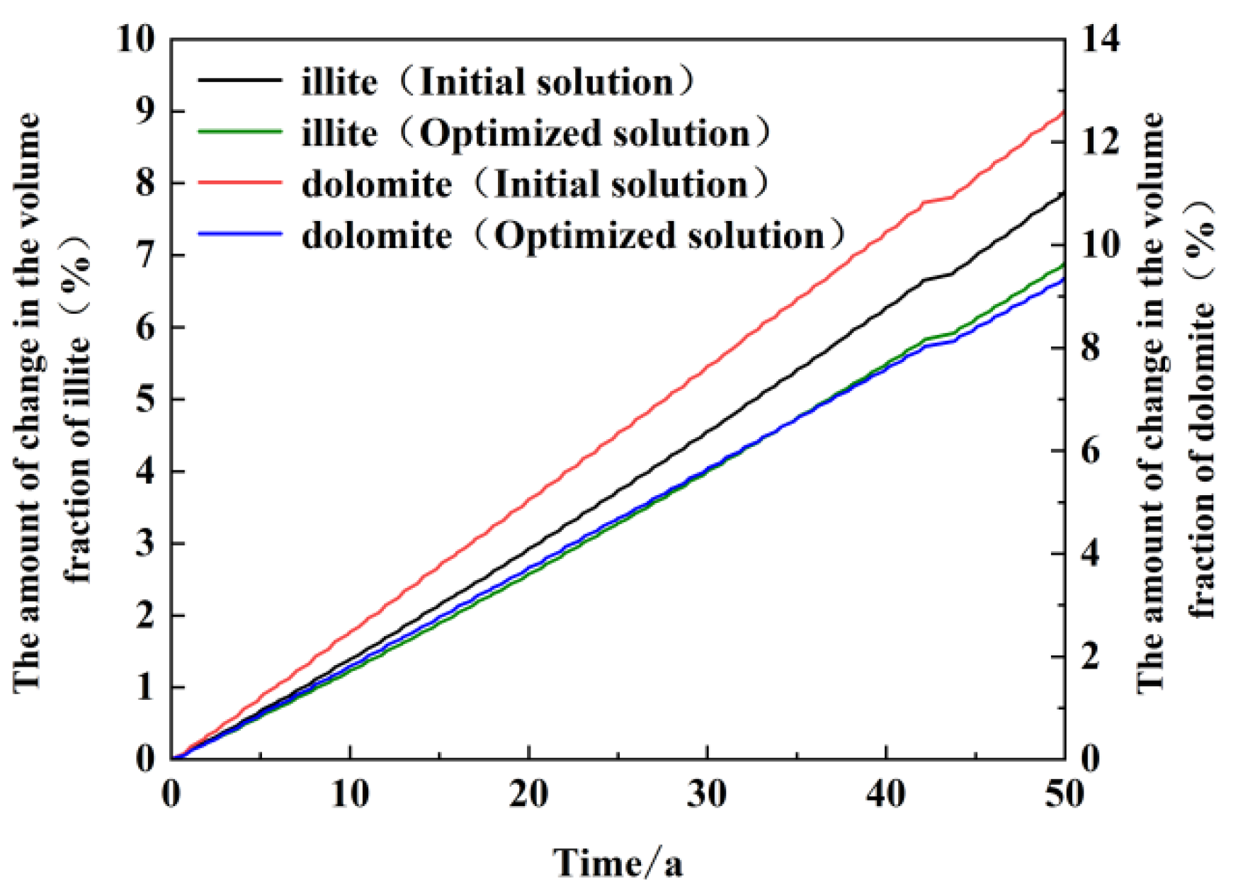 Overall, the change in proportion of each component is relatively minor, as evidenced by the time scale. The precipitation of minerals is relatively weak, and the formation of secondary minerals is not prevalent. The primary components of illite and dolomite are Al