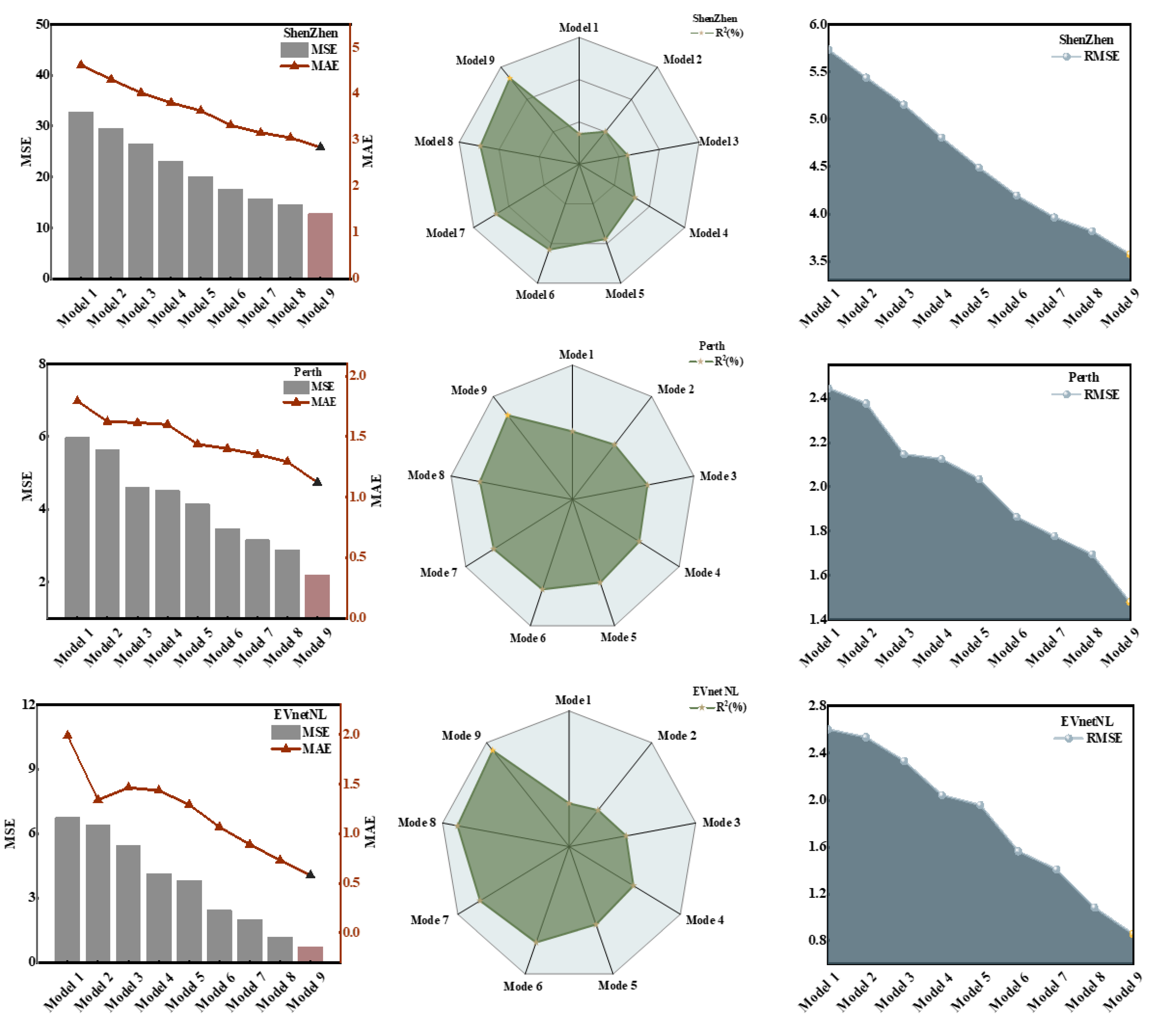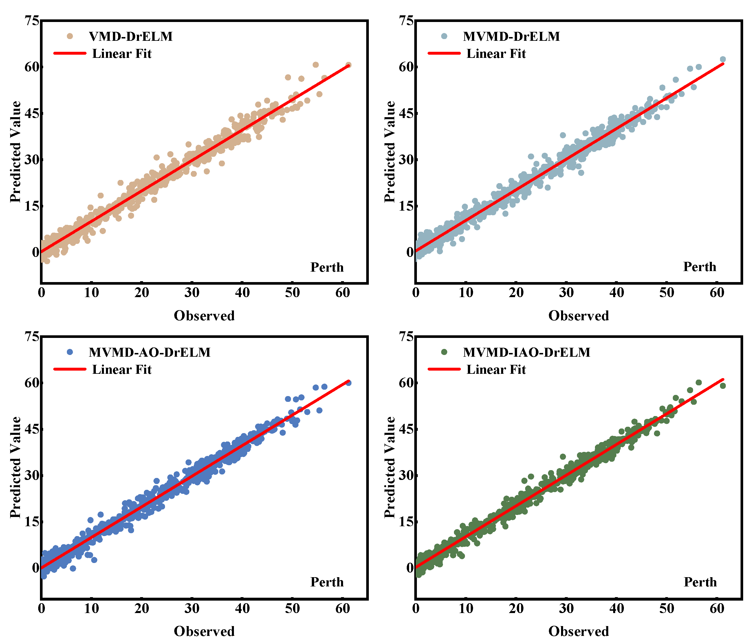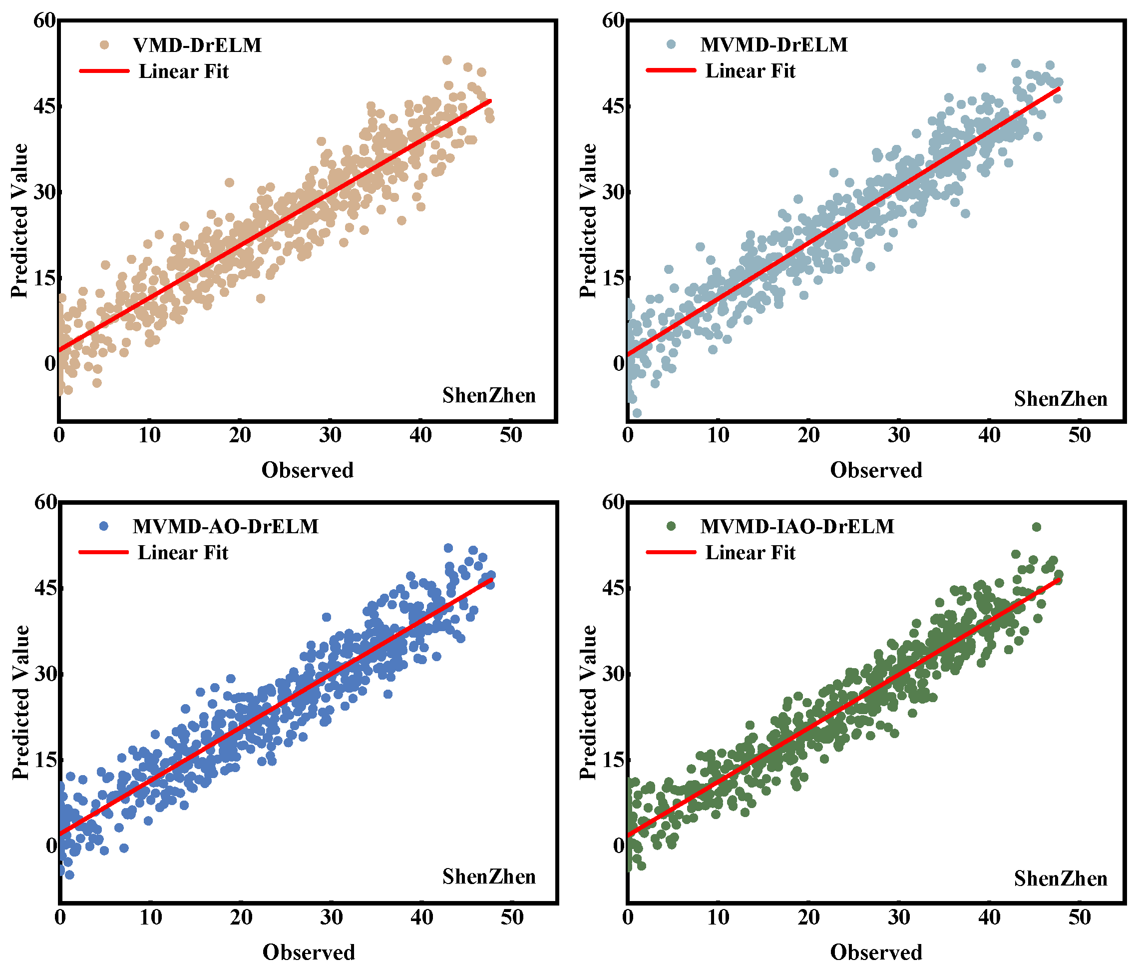 - Compared with the MVMD-AO-DrELM model, the MVMD-IAO-DrELM model proposed in this paper exhibits lower error metrics (MSE, RMSE, and MAE) and a higher R2 Coefficient of Determination. The experimental results demonstrate the positive impact of the improved IAO algorithm on the prediction model parameter optimization.