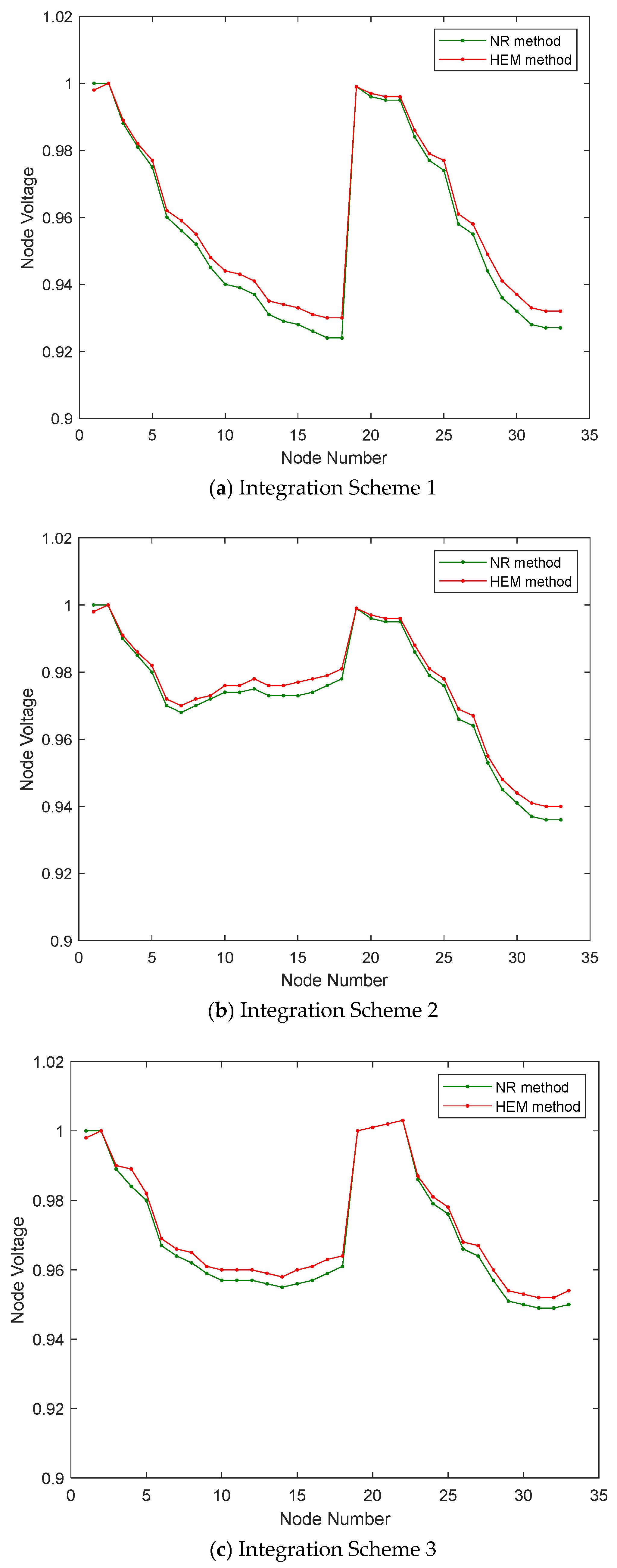 For each of the PV integration schemes mentioned above, node voltage calculations are performed using both the proposed method and the Newton-Raphson power flow algorithm. The specific parameters of the different PV integration schemes are listed in