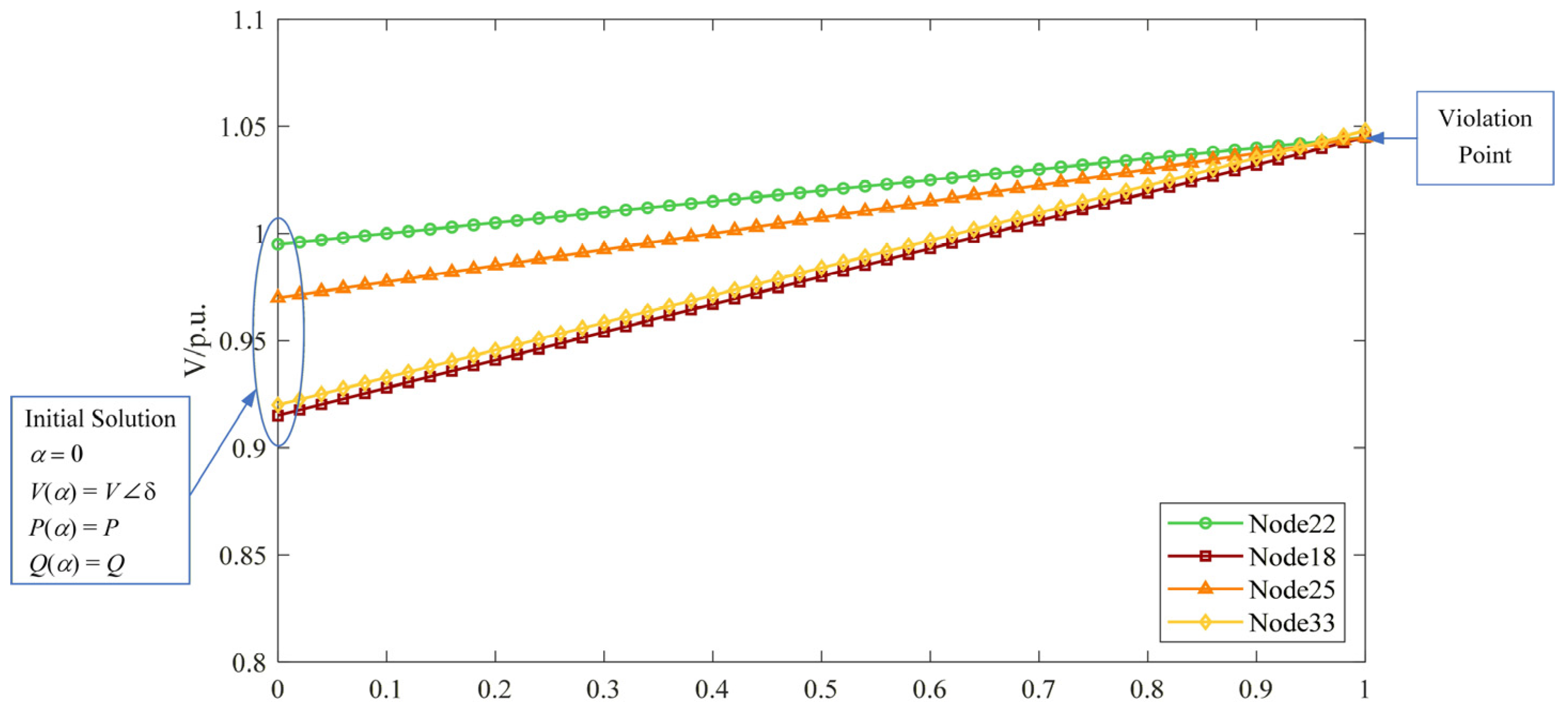 In the established IEEE 33-node distribution network simulation system, the secure operational upper limit for node voltages is set at 1.05 p.u.—exceeding this value is identified as a voltage limit violation—based on distribution network operation safety standards and engineering practice. Four branch-end nodes, numbered 18, 22, 25, and 33, are selected as DG integration points. The DG injection power directions corresponding to these four nodes are incorporated into the proposed holomorphic embedding algorithm. The algorithm automatically converts the PV output at each node into holomorphic embedding factors, which are then integrated with existing system parameters such as line impedances and load powers to form the holomorphic embedding equations.