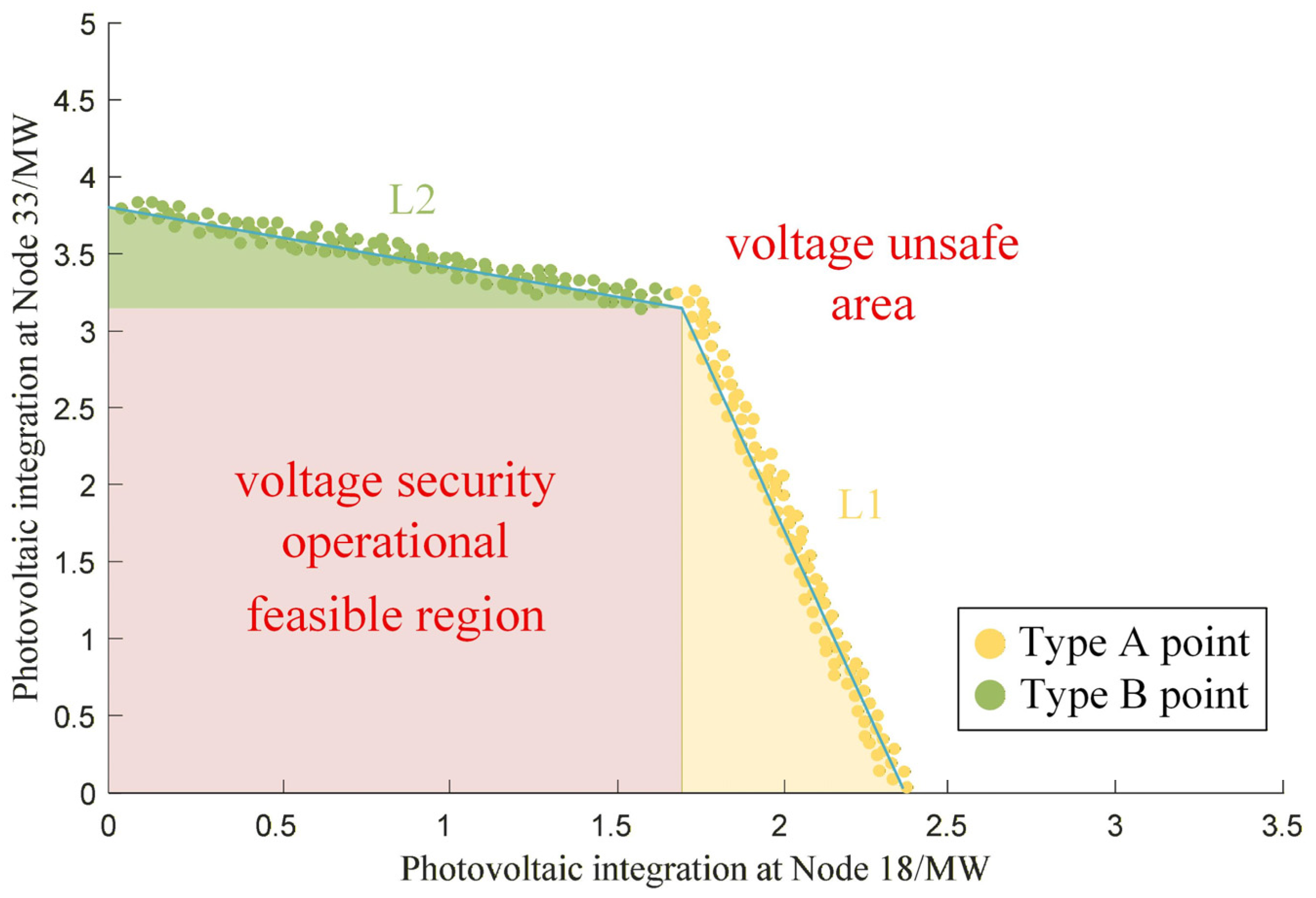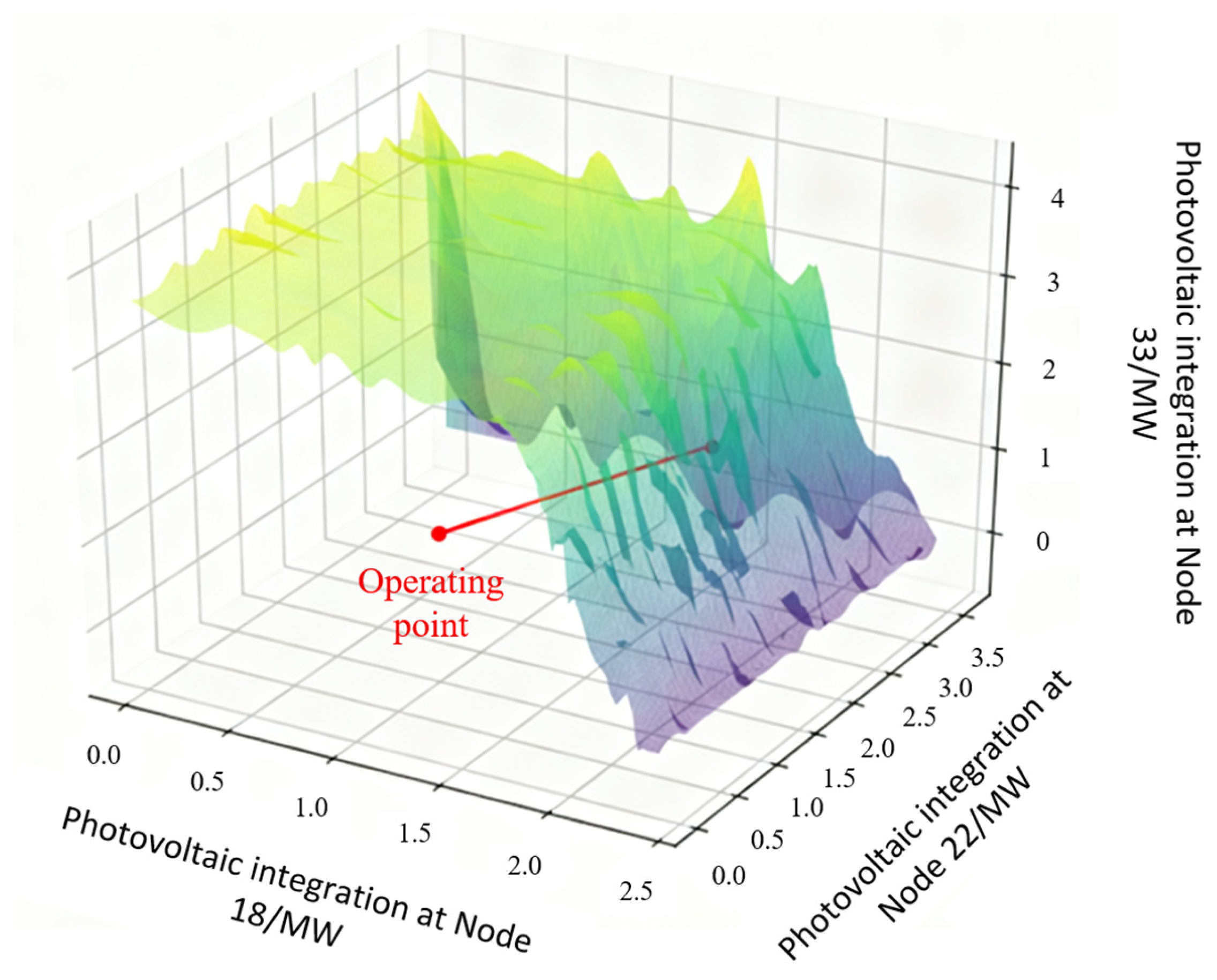 Figure 5. This feasible region visually reflects the secure matching relationship between the PV outputs at the two nodes—for example, when the PV injection at Node 18 is 1.5 MW, the maximum secure injection at Node 33 is 3.3 MW.