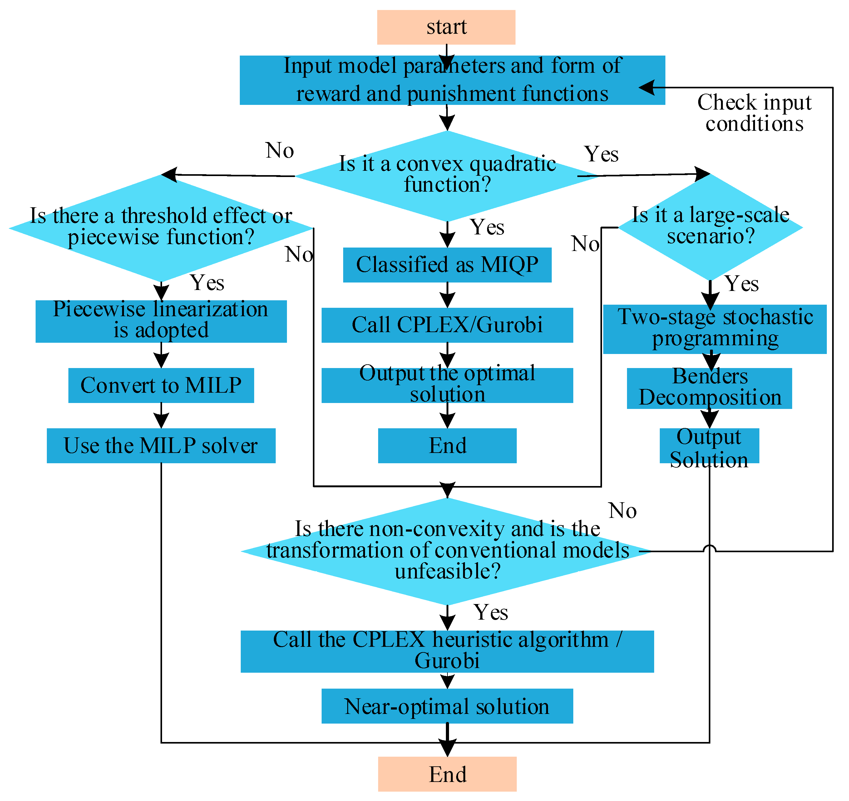 (1) When the reward–penalty function can be approximated as a convex quadratic form, solvers such as CPLEX or Gurobi are used for direct optimization.
