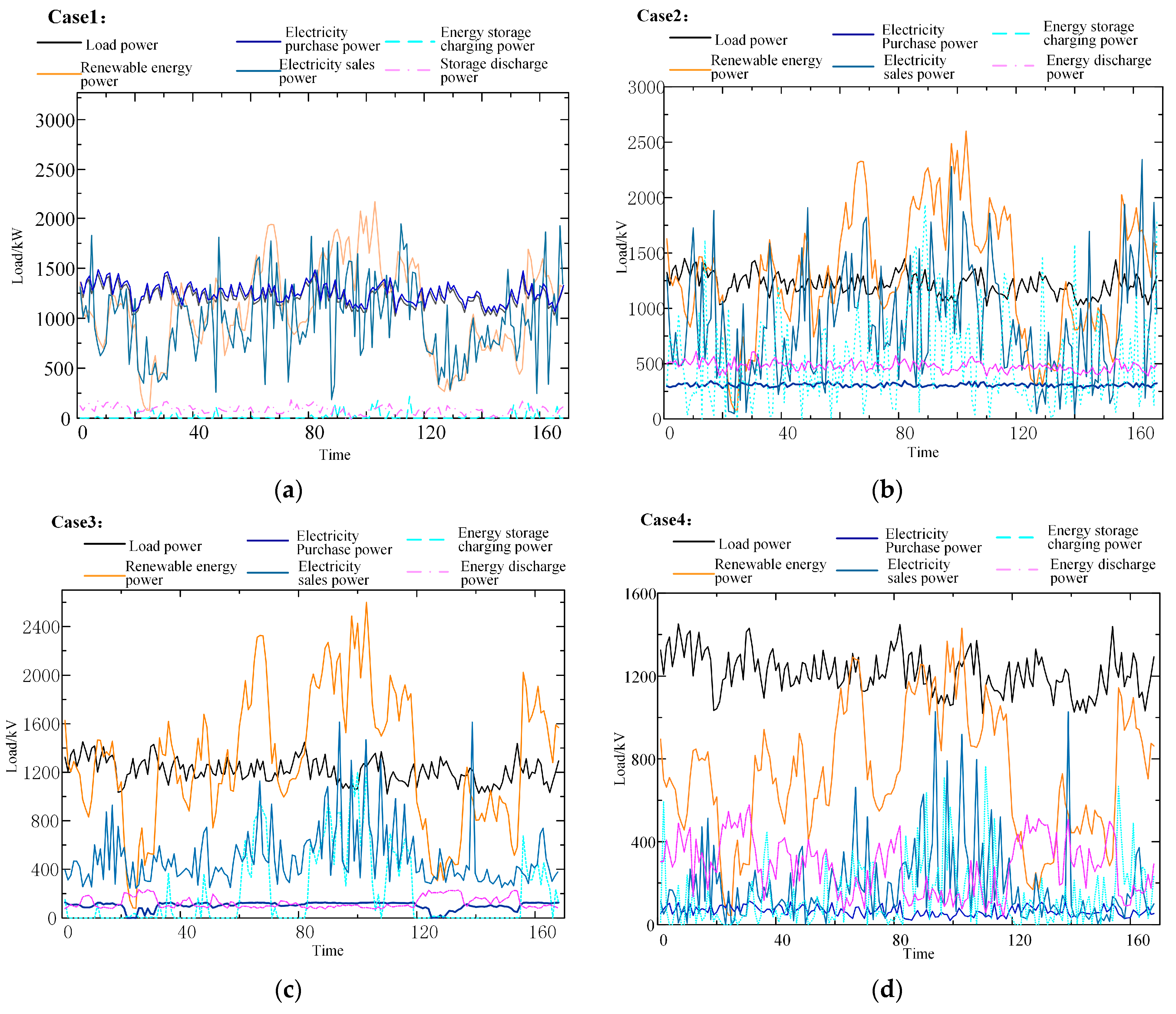 Figure 3 illustrates the typical power scheduling processes under the four scenarios, including load power, renewable generation, purchased power, sold power, and storage charge/discharge power.