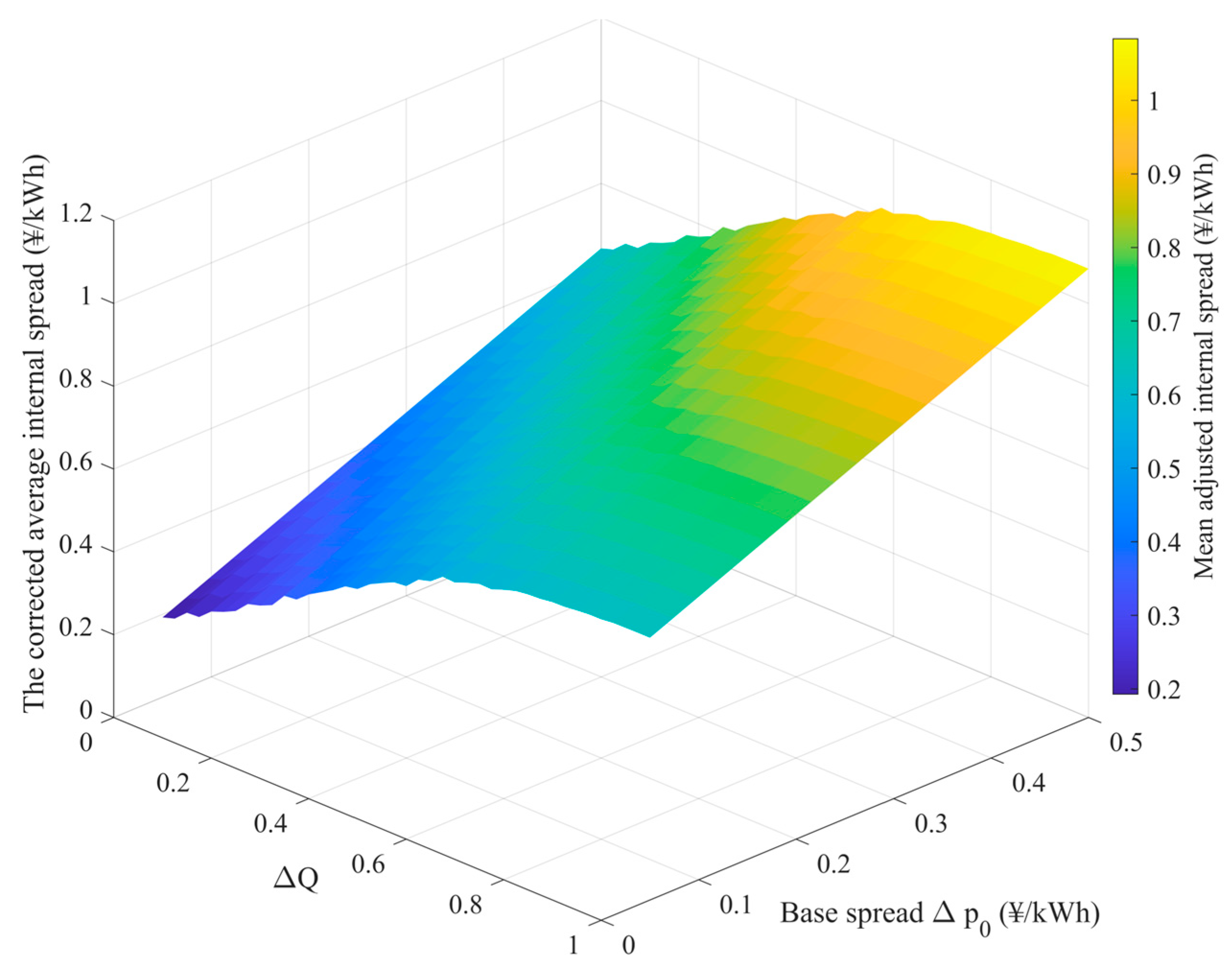 Figure 7 shows the price-spread surface under the reward–penalty pricing mechanism. A clear coupling effect between ΔQ and Δp
