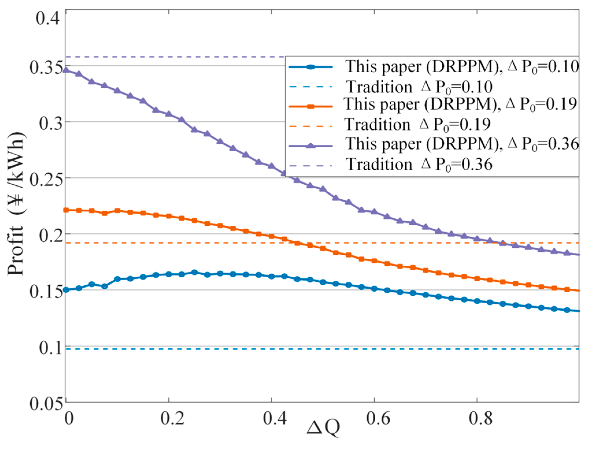 0 values. The results show that under the traditional method, the profit curve generally decreases with increasing ΔQ, indicating vulnerability to PQ fluctuations. In contrast, under the proposed method, profits remain in a higher range across different benchmark price differences, such as Δp