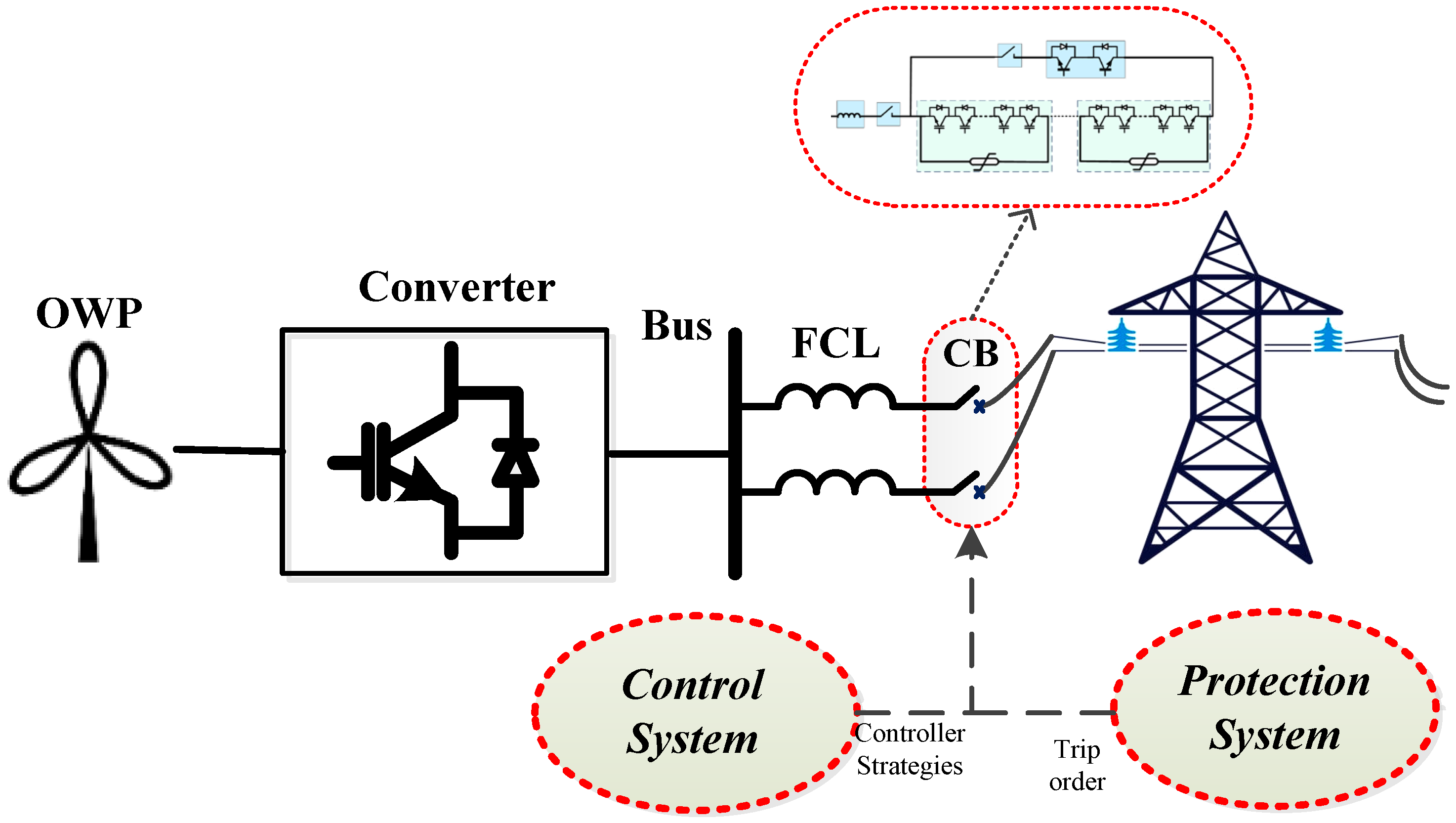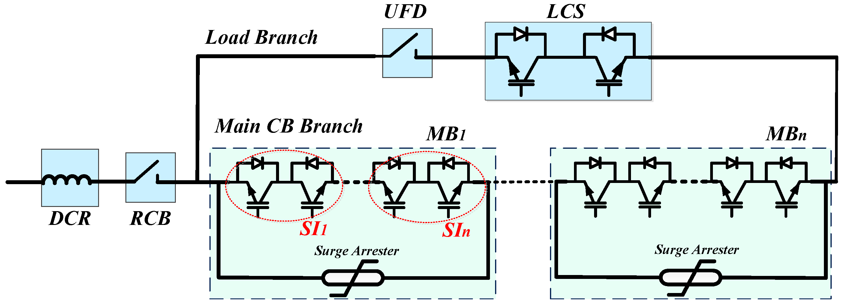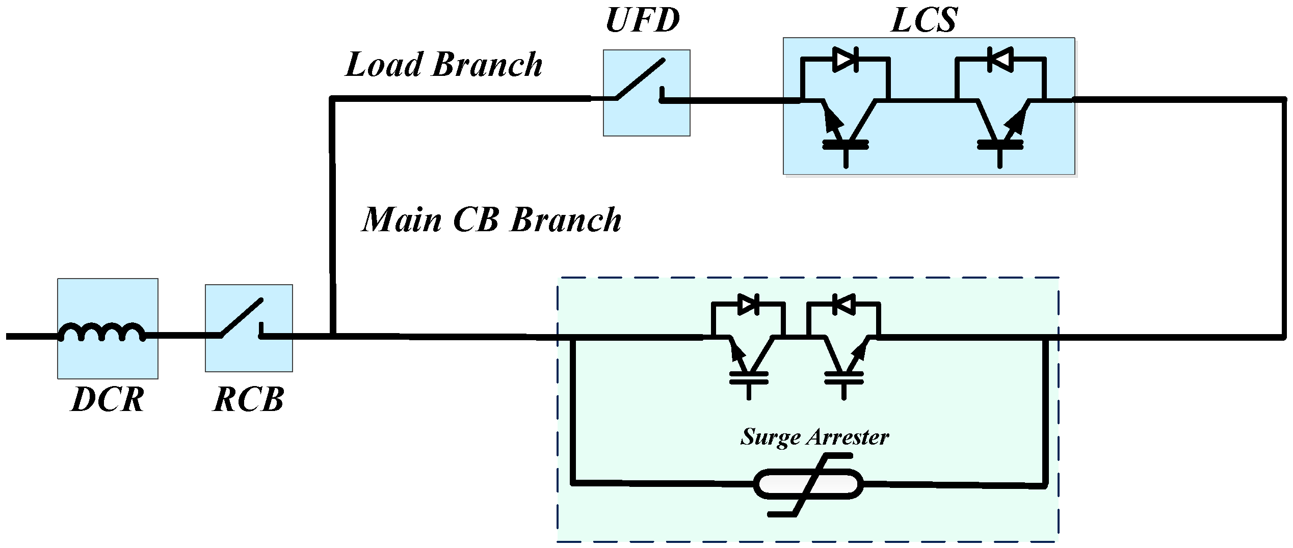 25]. Hybrid DCCBs consist of load and main CB branches connected in parallel. To reduce the short-circuit current, a DC reactor (DCR) is connected in series with the DCCBs.