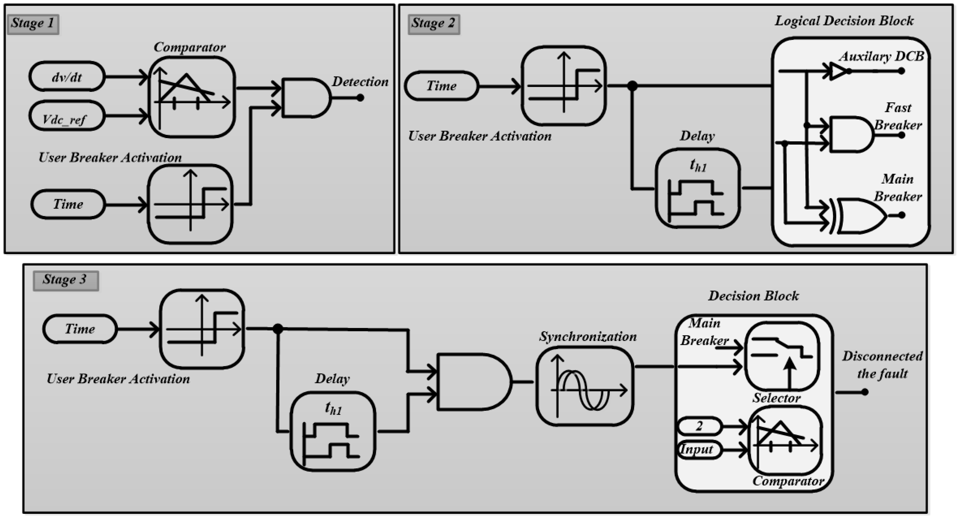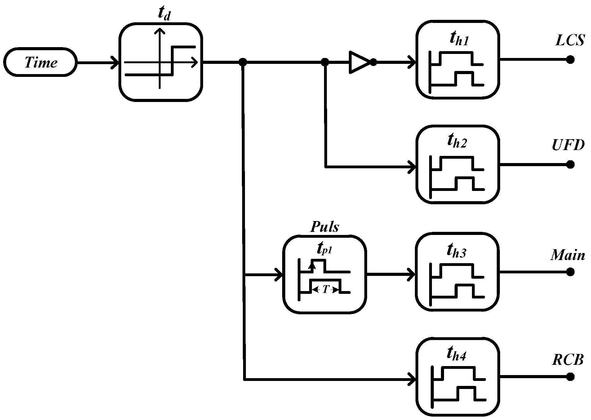 On the other hand, the hybrid control structure mainly comprises the control of RCB control, UFD control, and LCS in the auxiliary DC breaker control and the main DC breaker control. The objective is determined as to operate in an effectively coordinated manner. In this context, the control structure is formed in three stages. In the first stage, the fault detection logic sends a signal to the control components to disconnect the faulted line. In the second stage, logic gates are utilized to determine when to activate the fast disconnector and the main DC breaker. The load and main branch CBs are activated at this stage. In the third stage, the operation of the main DC breaker based on the synchronization status is decided. Additionally, a comparator block can be incorporated to coordinate the final signal at this stage. It can be seen that the control structure is constituted by using logic gates, time delay blocks, and comparators. In the control structure, it is significant to determine the sequence of operation. In this manner, the breakers are activated in a proper manner. The control structure is illustrated in